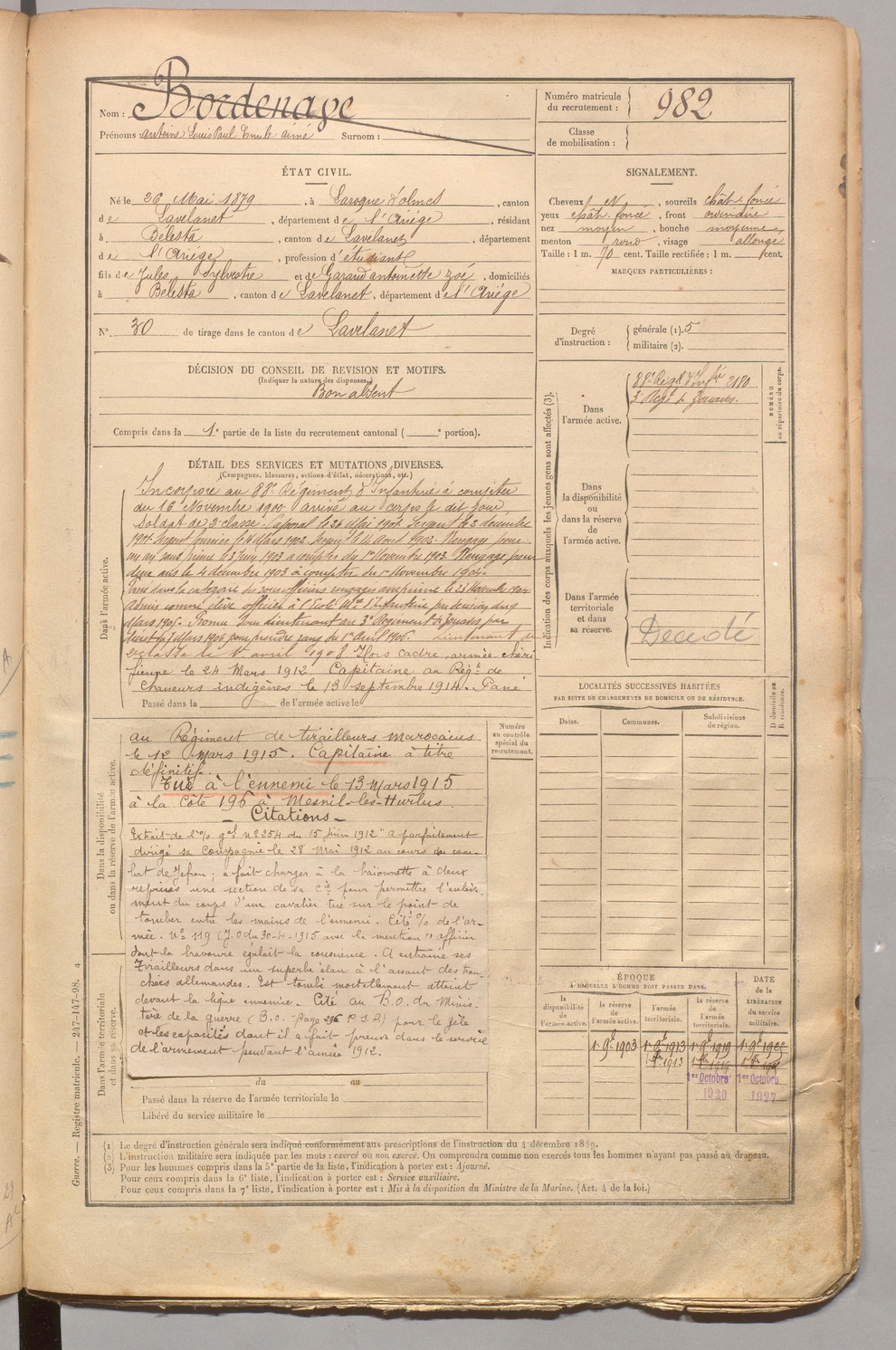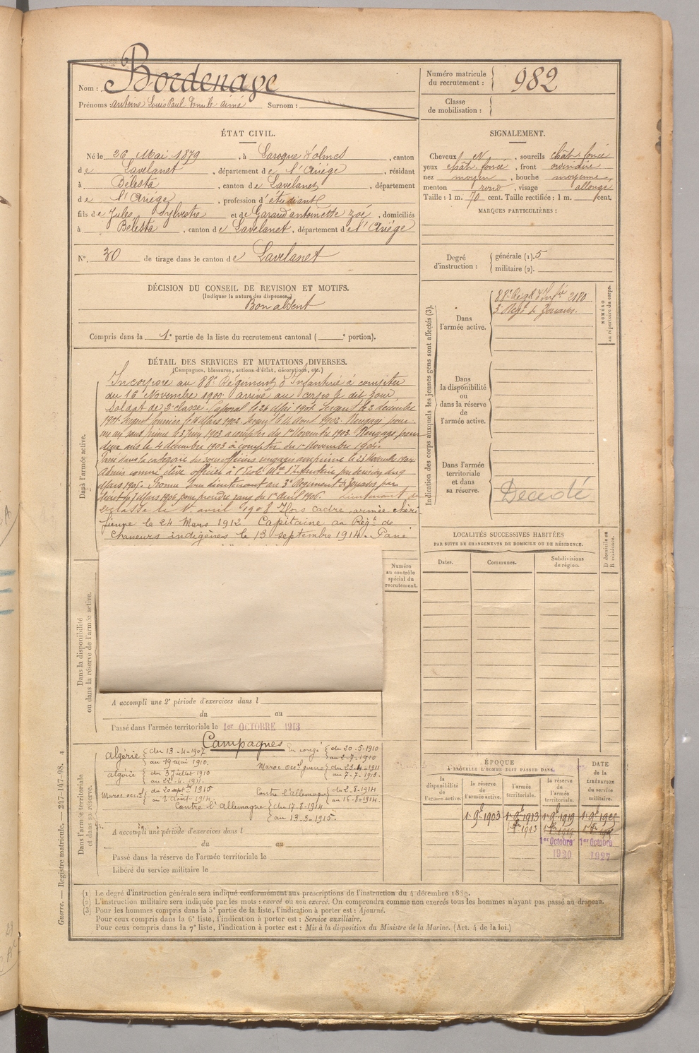 | Bordenave | Antoine Louis Paul Emile Aimé | FOIX | 1 R 458 | 1899 | Laroque-d'Olmes | Bélesta | 982 |