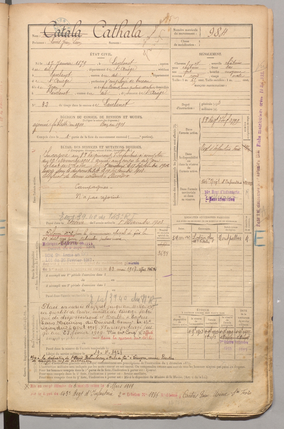 | Cathala | Louis Jean Léon | FOIX | 1 R 458 | 1899 | Lavelanet | Lavelanet | 984 |