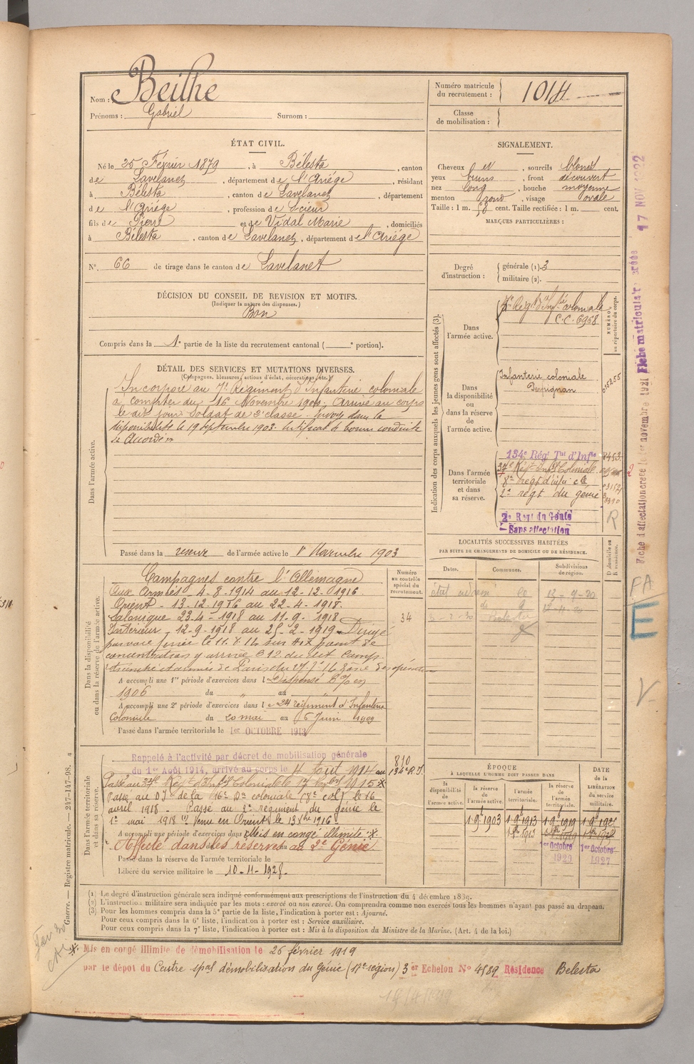 | Beilhe | Gabriel | FOIX | 1 R 458 | 1899 | Bélesta | Bélesta | 1014 |