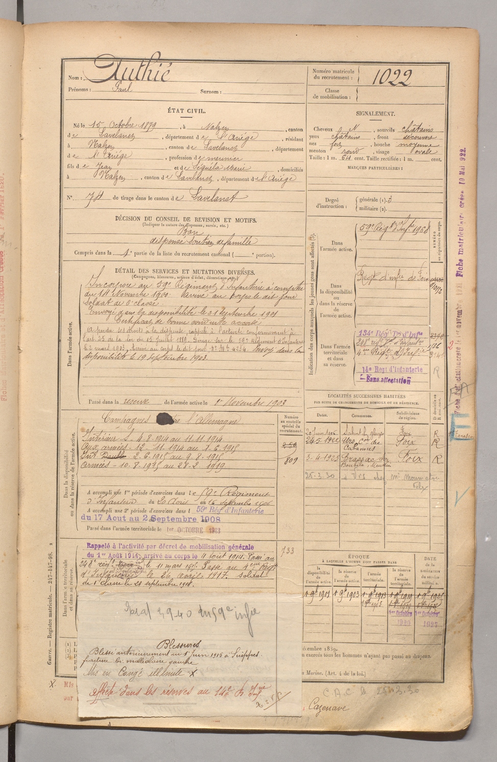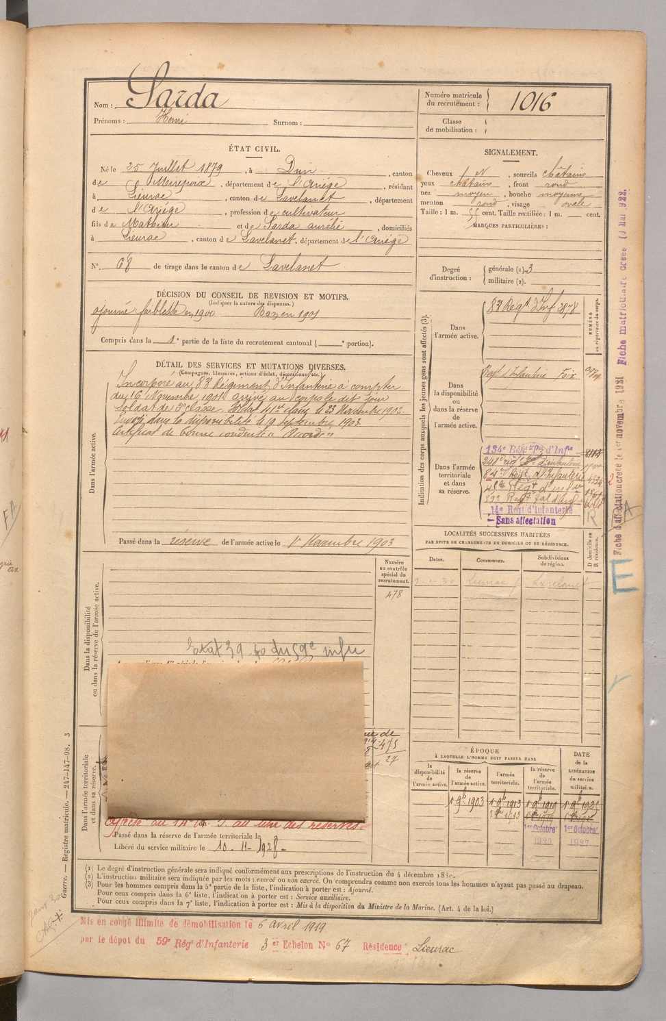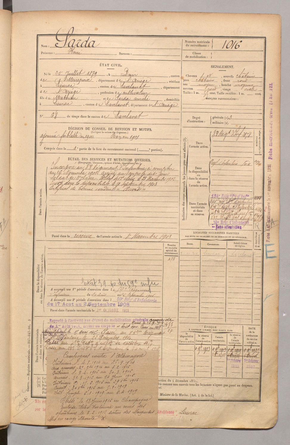 | Sarda | Henri | FOIX | 1 R 458 | 1899 | Dun | Lieurac | 1016 |