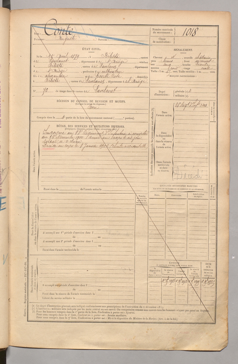 | Conte | Auguste | FOIX | 1 R 458 | 1899 | Bélesta | Bélesta | 1018 |