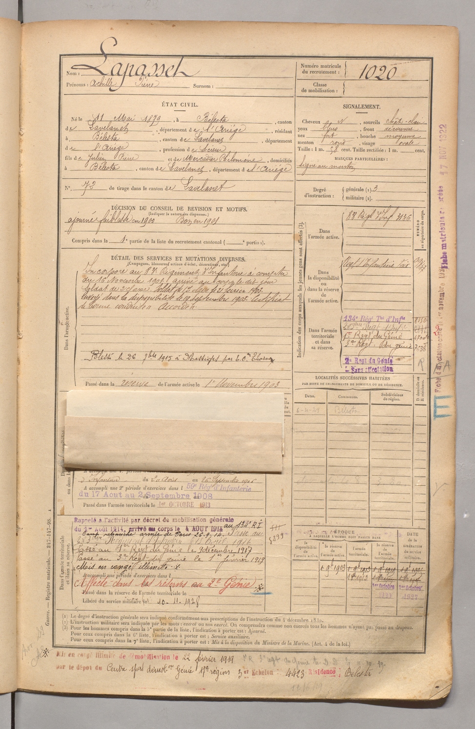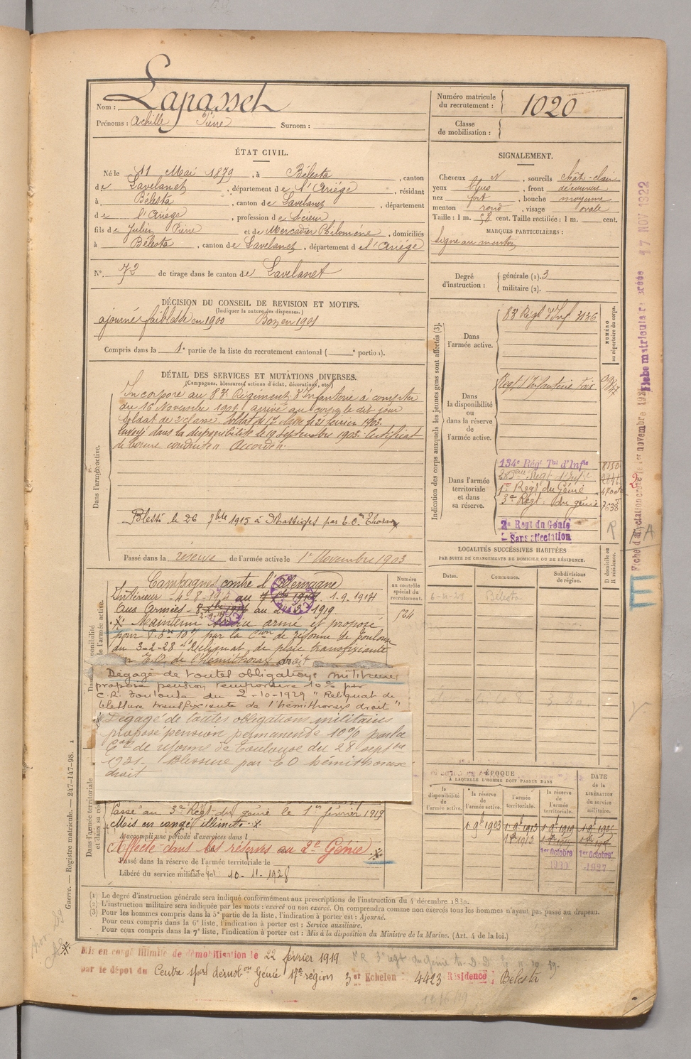 | Lapasset | Achille Pierre | FOIX | 1 R 458 | 1899 | Bélesta | Bélesta | 1020 |