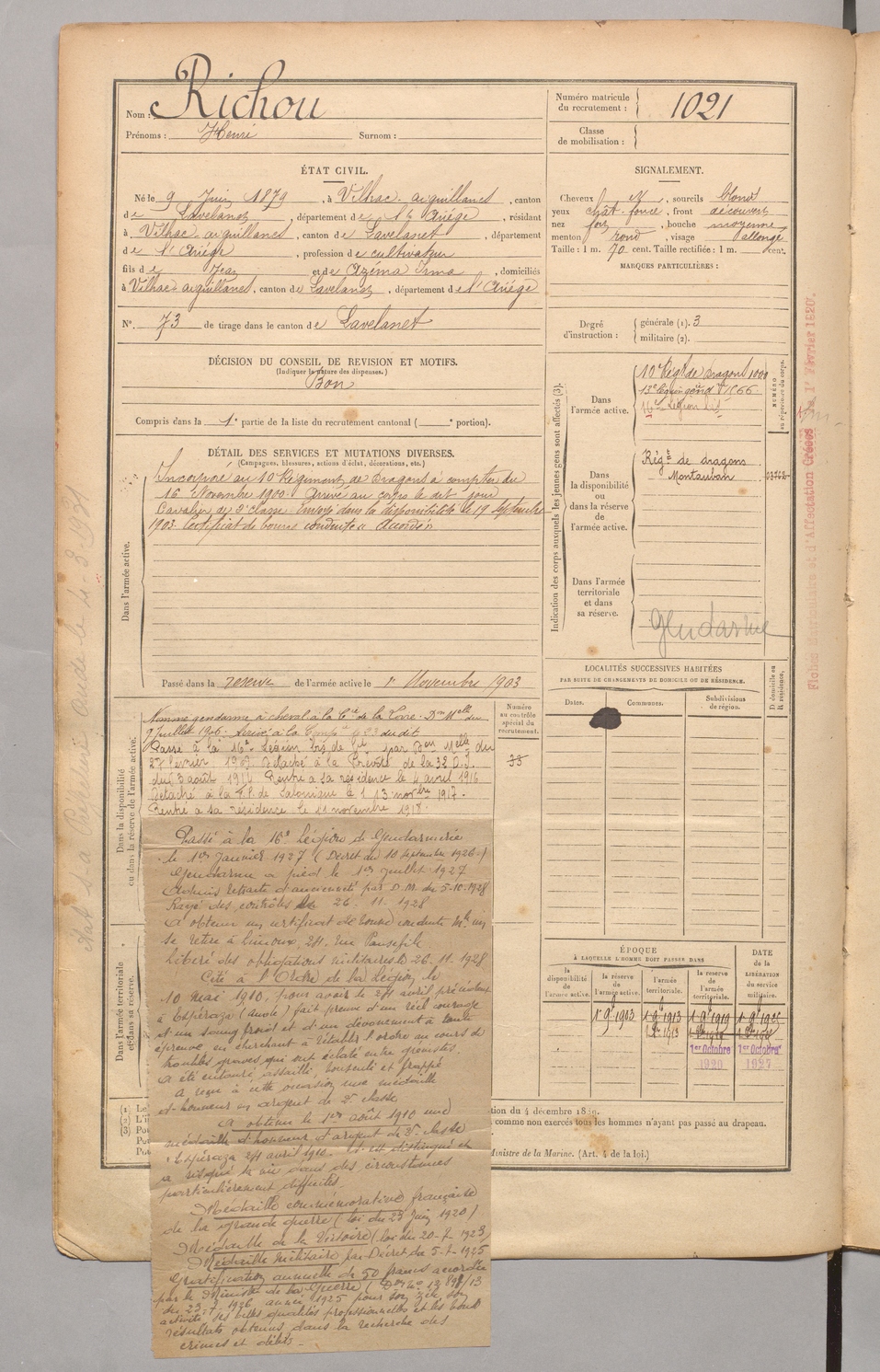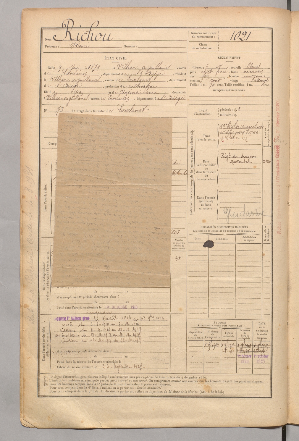 | Richou | Henri | FOIX | 1 R 458 | 1899 | Vilhac-Aigullanes | Vilhac-Aiguillanes | 1021 |