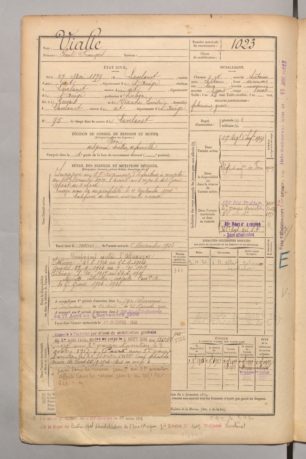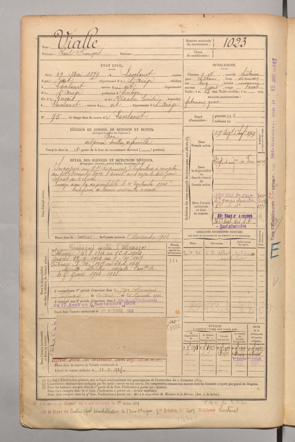 | Vialle | Paul François | FOIX | 1 R 458 | 1899 | Lavelanet | Lavelanet | 1023 |