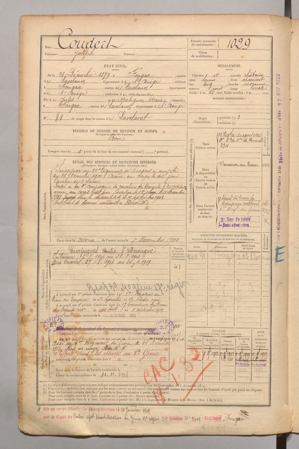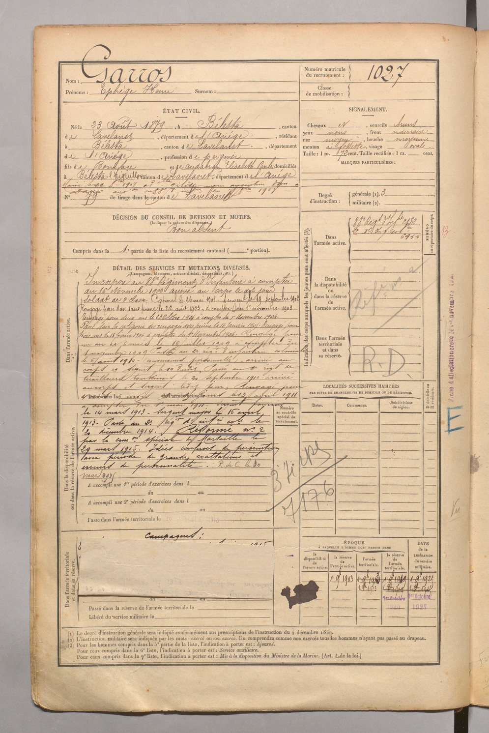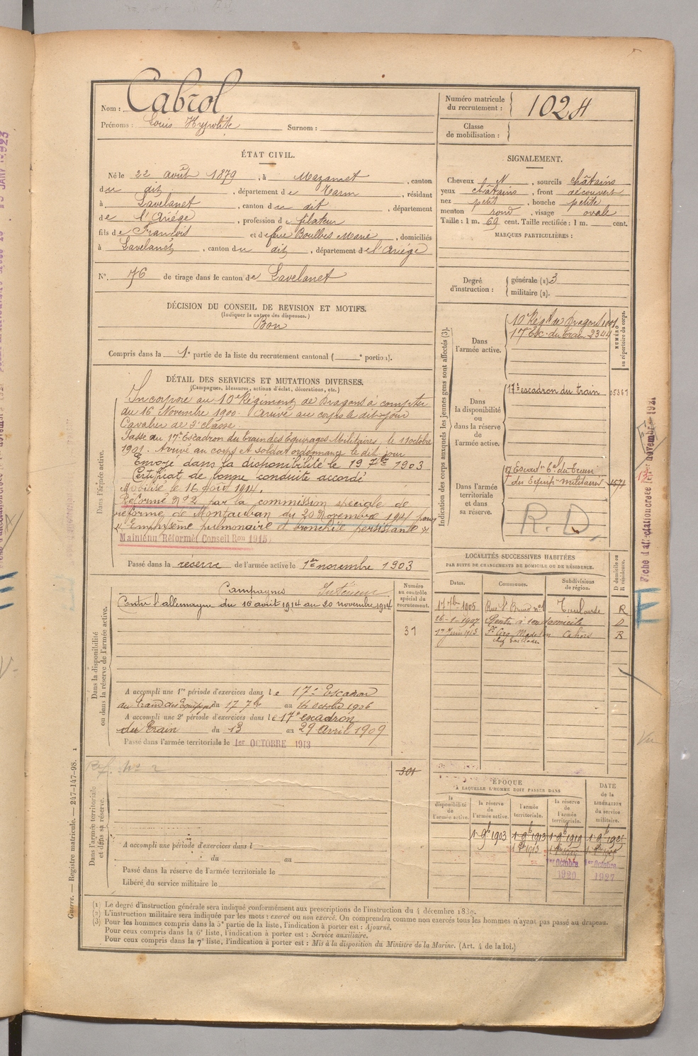 | Cabrol | Louis Hyppolite | FOIX | 1 R 458 | 1899 | Mazamet | Lavelanet | 1024 |