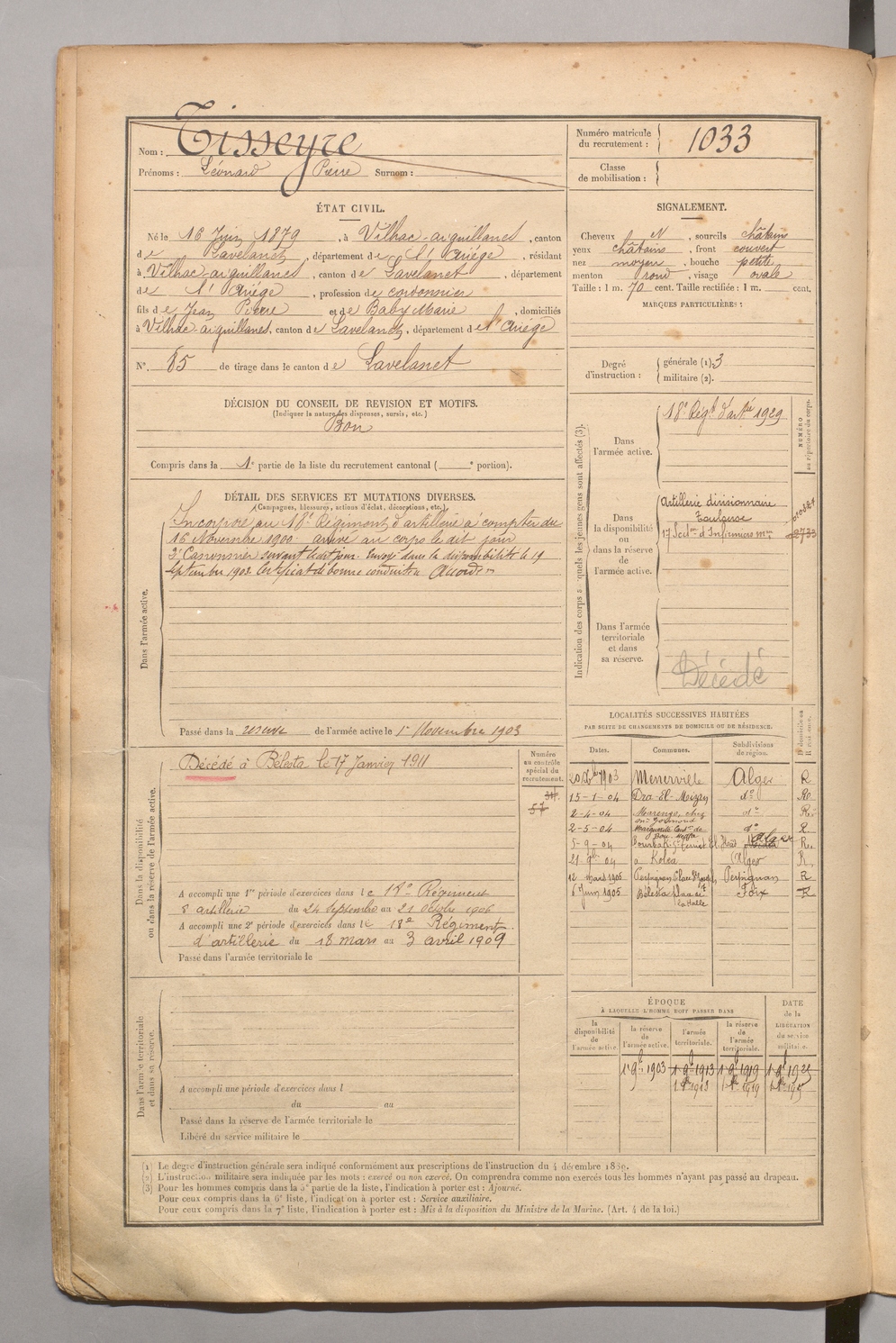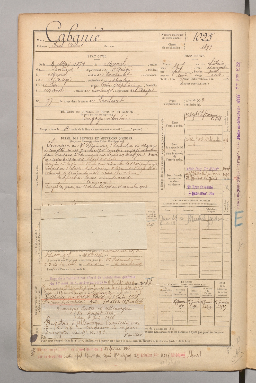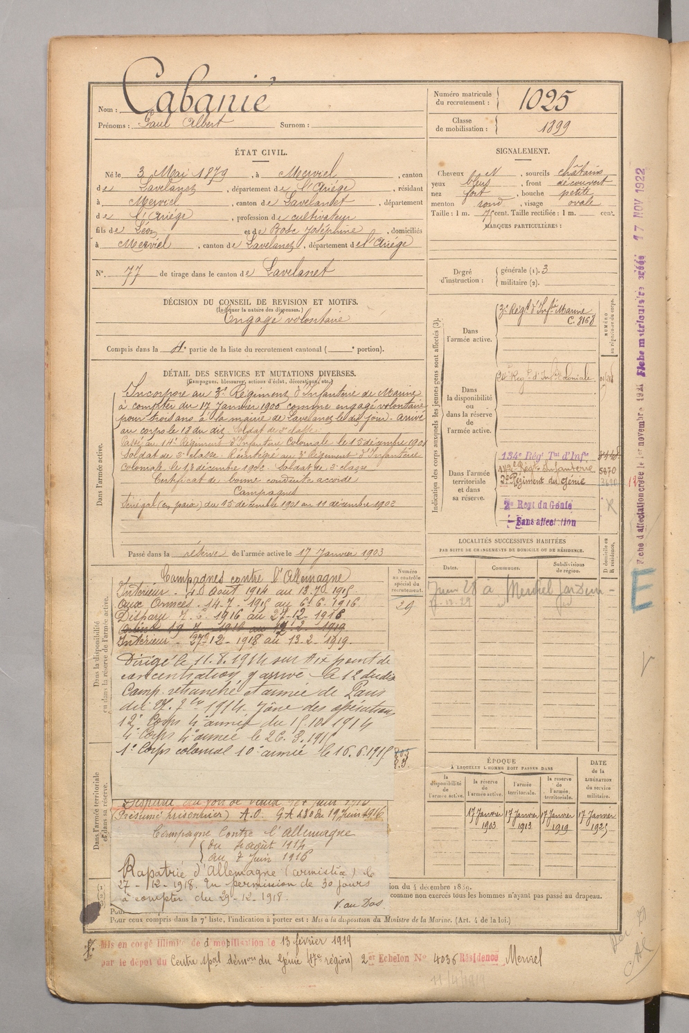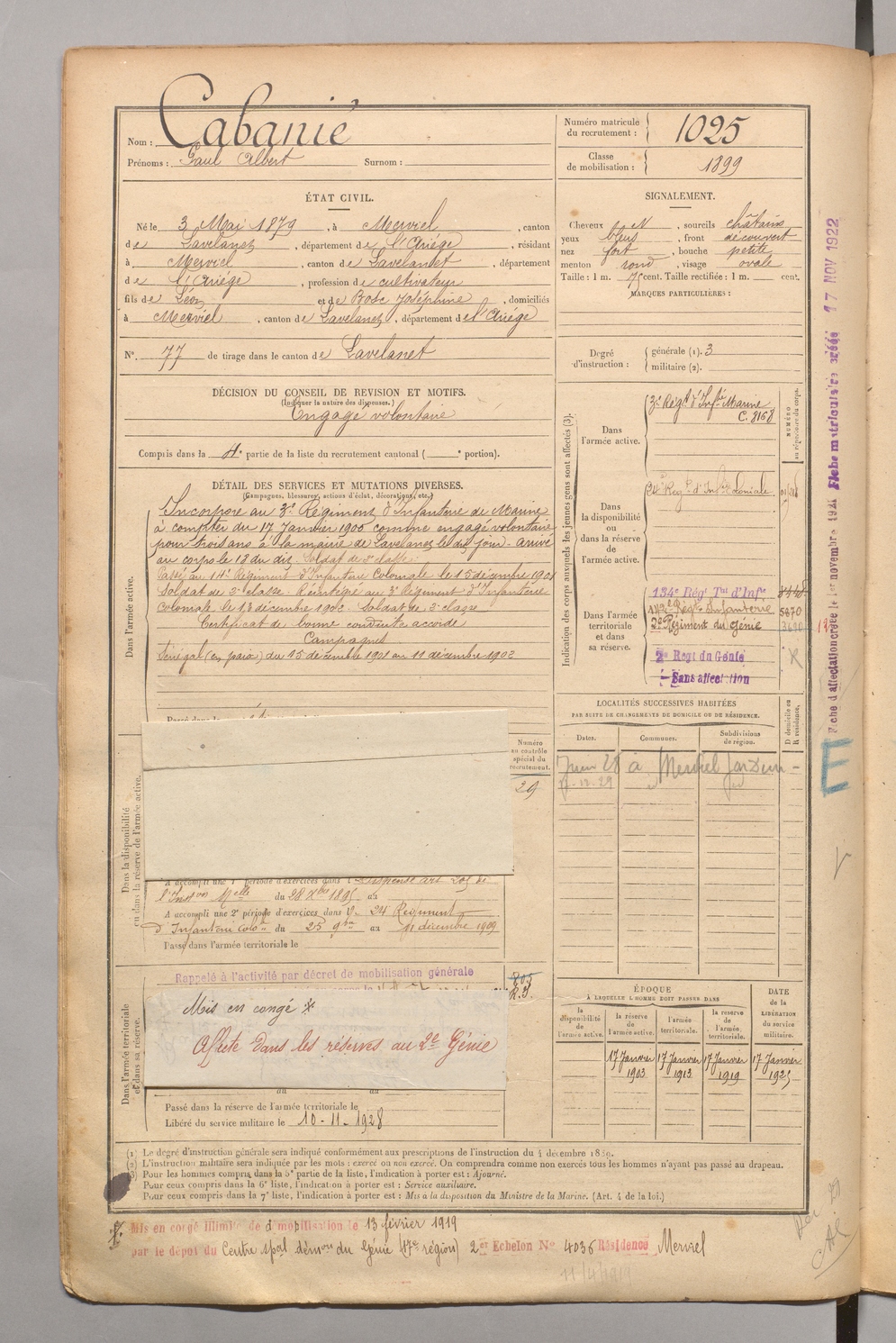 | Cabanié | Paul Albert | FOIX | 1 R 458 | 1899 | Merviel (Le) | Merviel (Le) | 1025 |