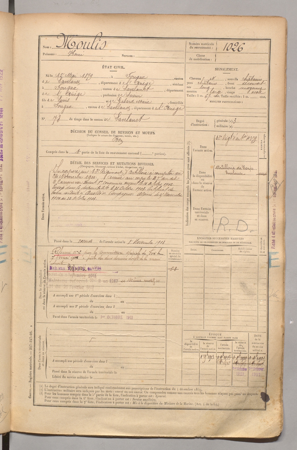 | Moulis | Henri | FOIX | 1 R 458 | 1899 | Fougax-et-Barrineuf | Fougax-et-Barrineuf | 1026 |