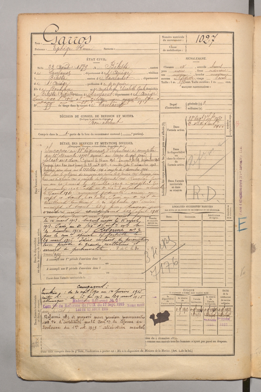 | Garros | Ephège Henri | FOIX | 1 R 458 | 1899 | Bélesta | Bélesta | 1027 |