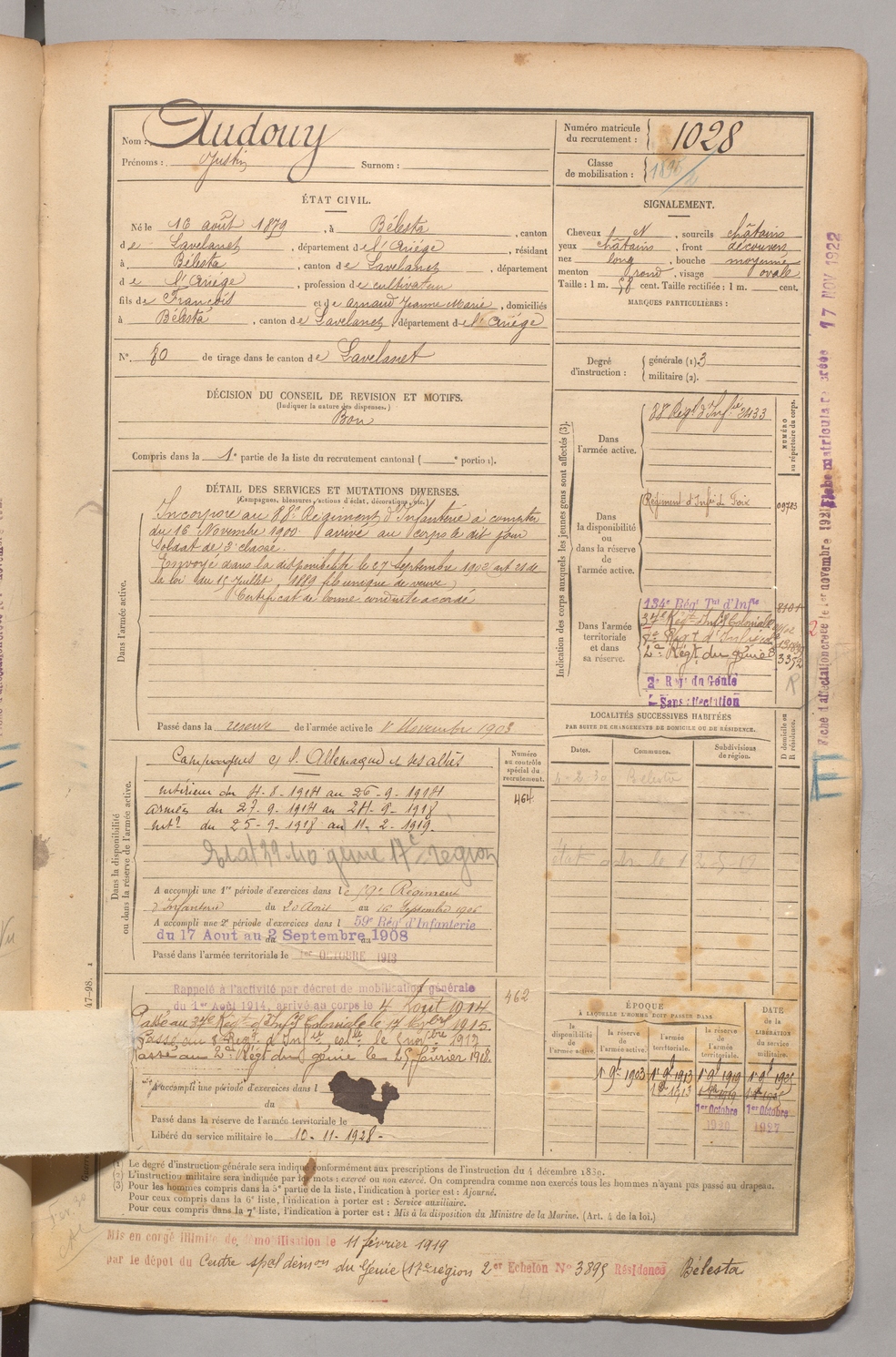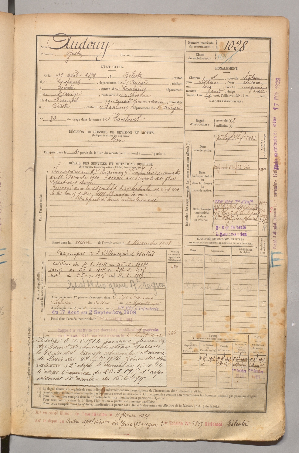 | Audouy | Justin | FOIX | 1 R 458 | 1899 | Bélesta | Bélesta | 1028 |