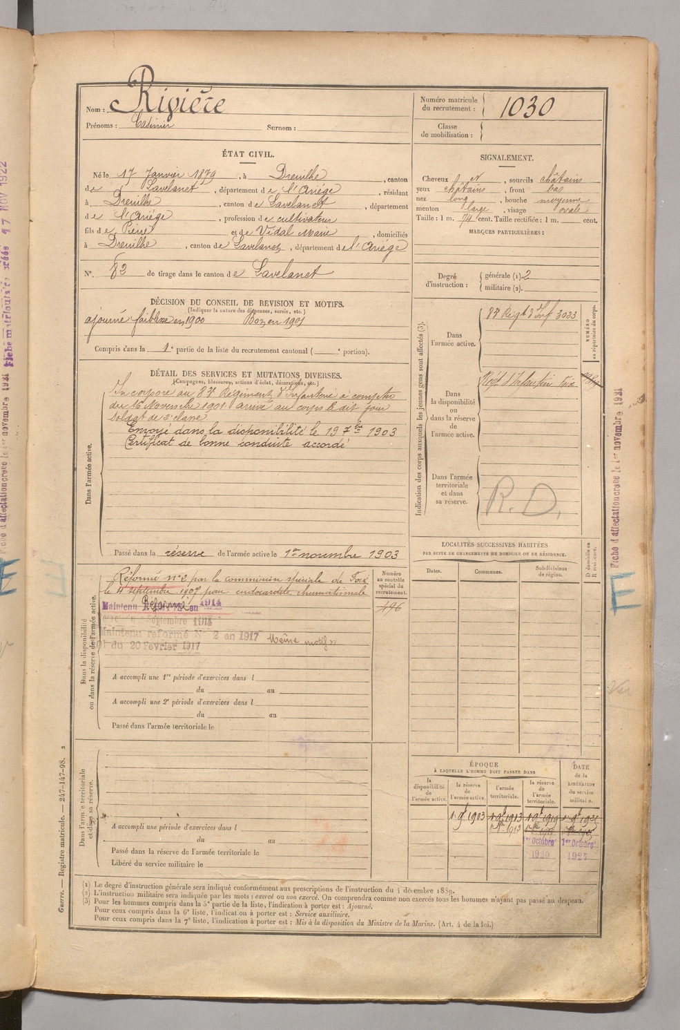 | Rivière | Casimir | FOIX | 1 R 458 | 1899 | Dreuilhe | Dreuilhe | 1030 |