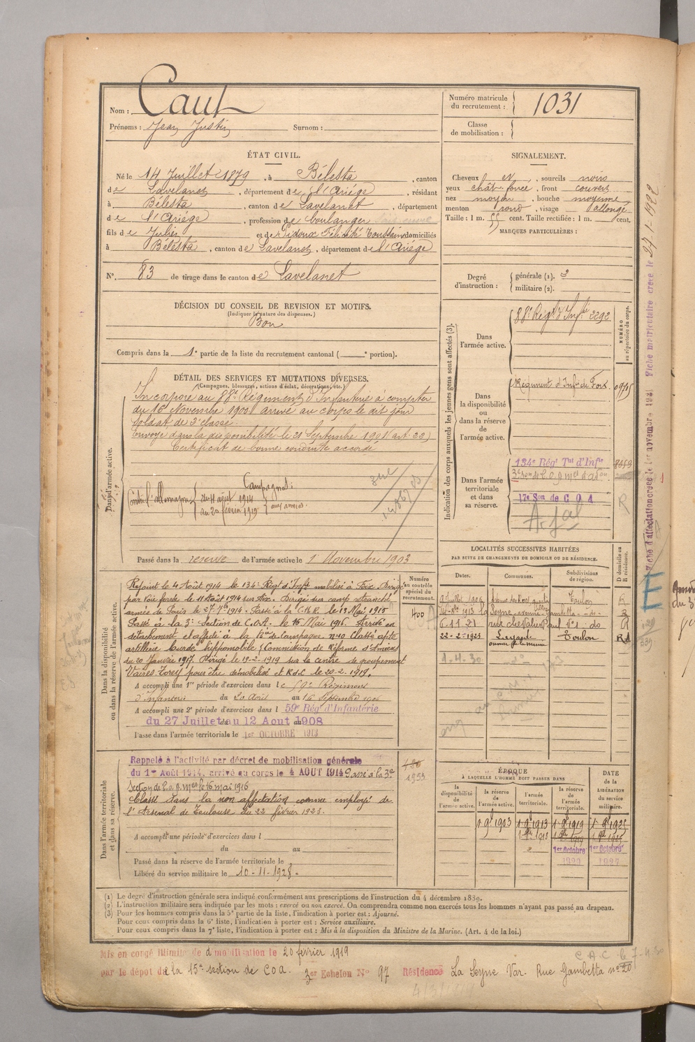 | Caut | Jean Justin | FOIX | 1 R 458 | 1899 | Bélesta | Bélesta | 1031 |