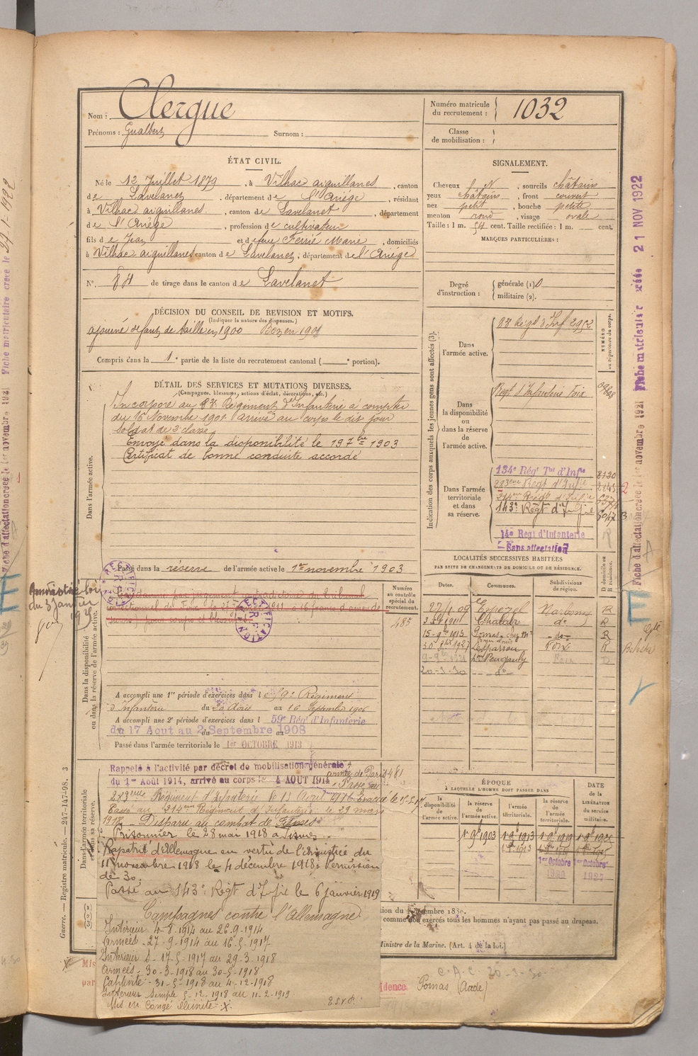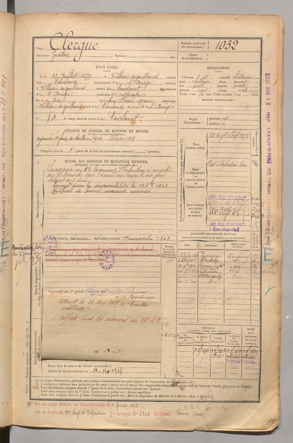 | Clergue | Gualbert | FOIX | 1 R 458 | 1899 | Vilhac-Aiguillanes | Vilhac-Aiguillanes | 1032 |