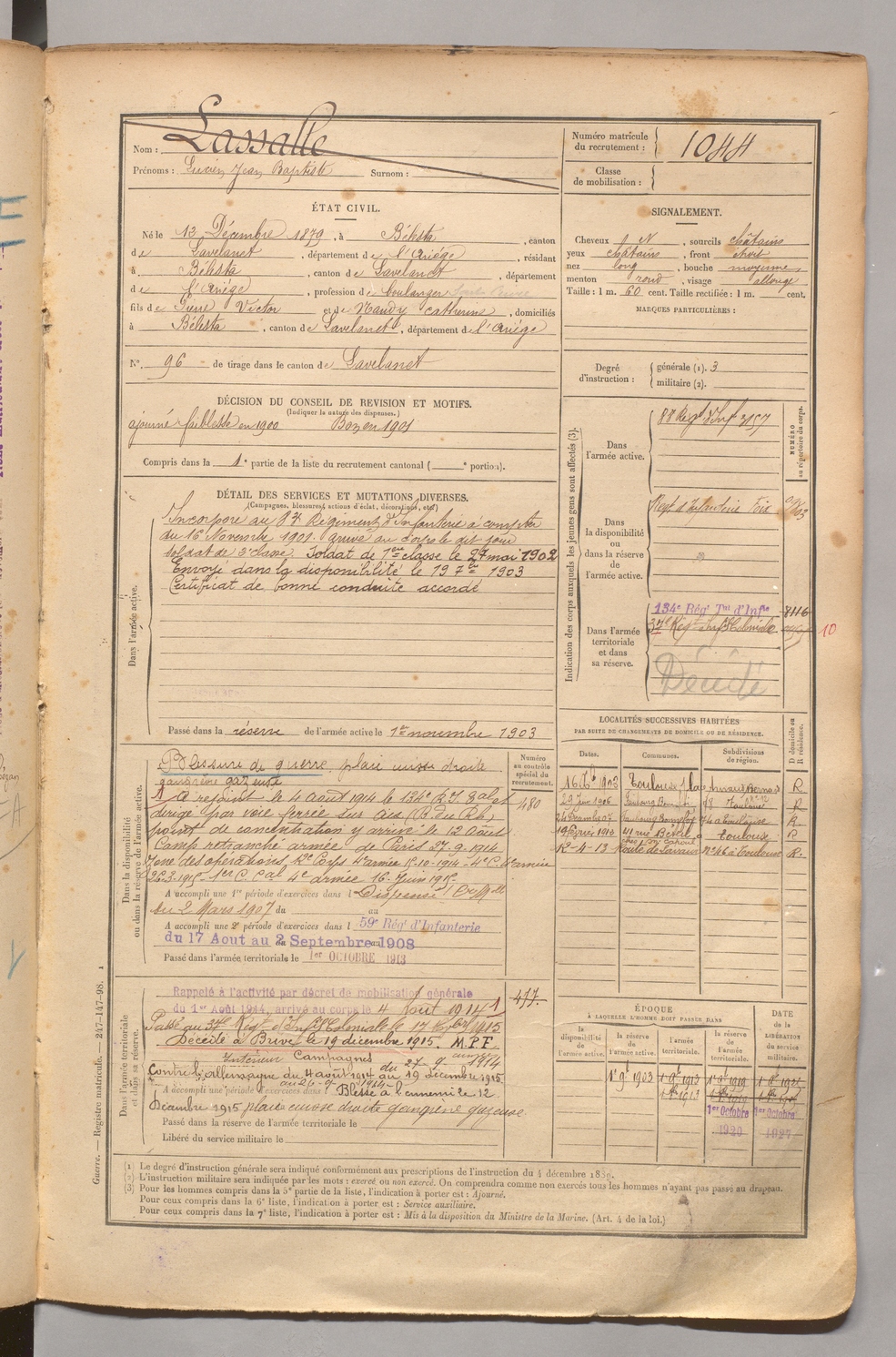 | Lassalle | Lucien Jean Baptiste | FOIX | 1 R 458 | 1899 | Bélesta | Bélesta | 1044 |