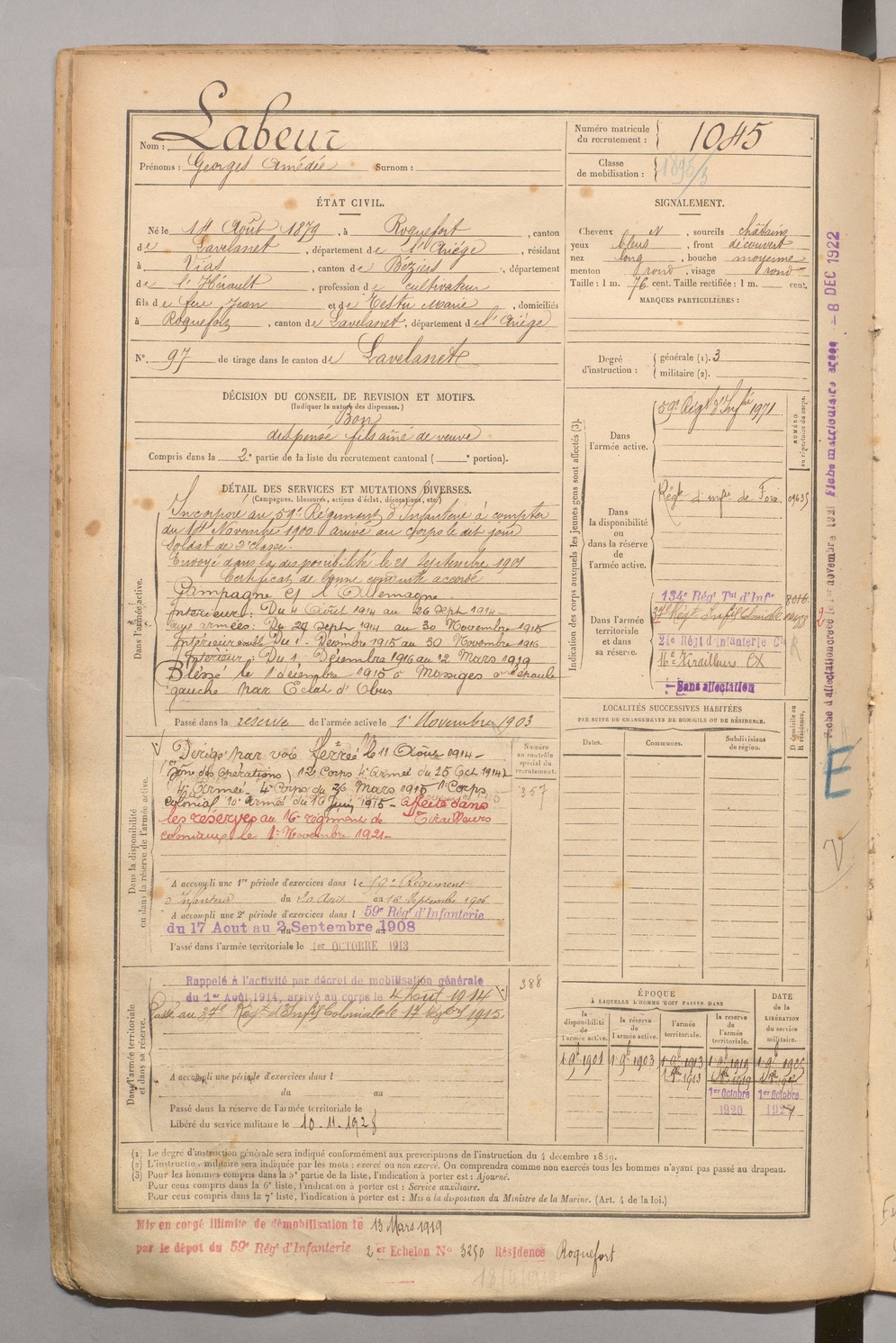 | Labeur | Georges Amédée | FOIX | 1 R 458 | 1899 | Roquefort-les-Cascades | Vias | 1045 |