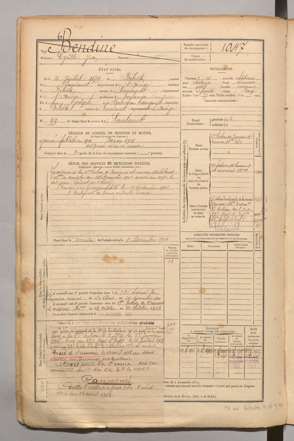 | Bendine | Cyrille Jean | FOIX | 1 R 458 | 1899 | Bélesta | Bélesta | 1047 |