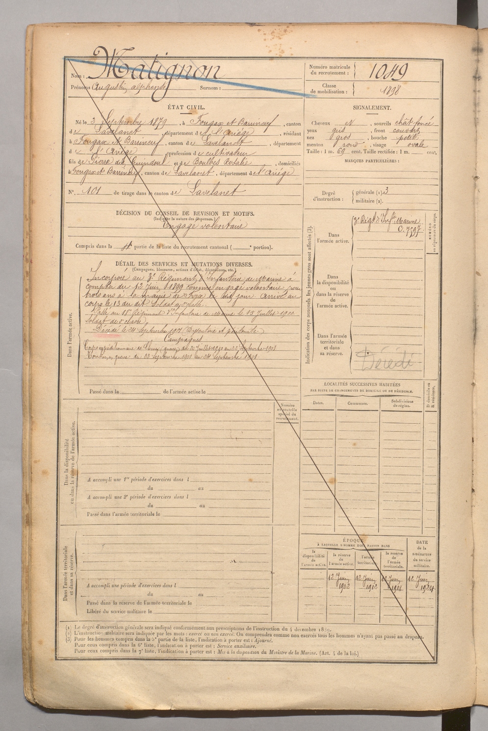 | Matignon | Augustin Alphonse | FOIX | 1 R 458 | 1899 | Fougax-et-Barrineuf | Fougax-et-Barrineuf | 1049 |