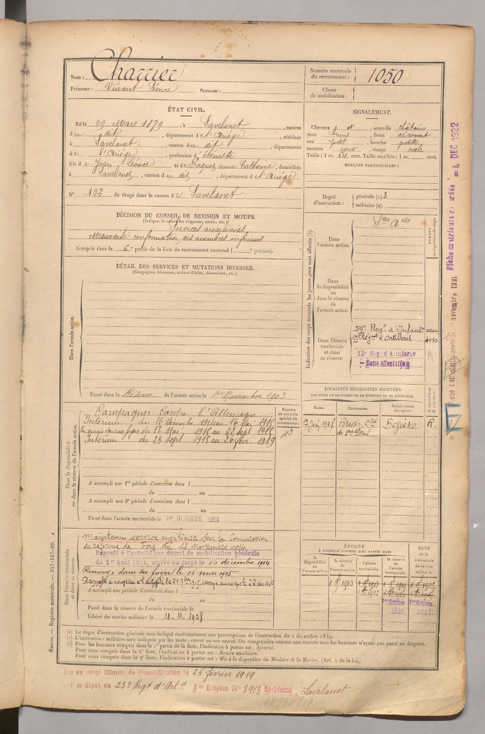 | Charrier | Vincent Léonce | FOIX | 1 R 458 | 1899 | Lavelanet | Lavelanet | 1050 |