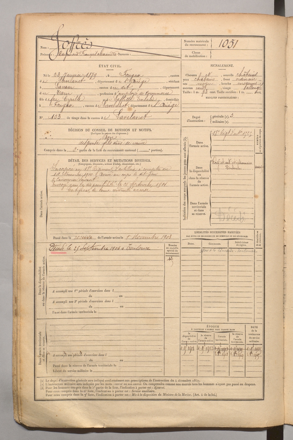 | Joffrès | Raymond François Alexandre | FOIX | 1 R 458 | 1899 | Fougax-et-Barrineuf | Lavaur | 1051 |