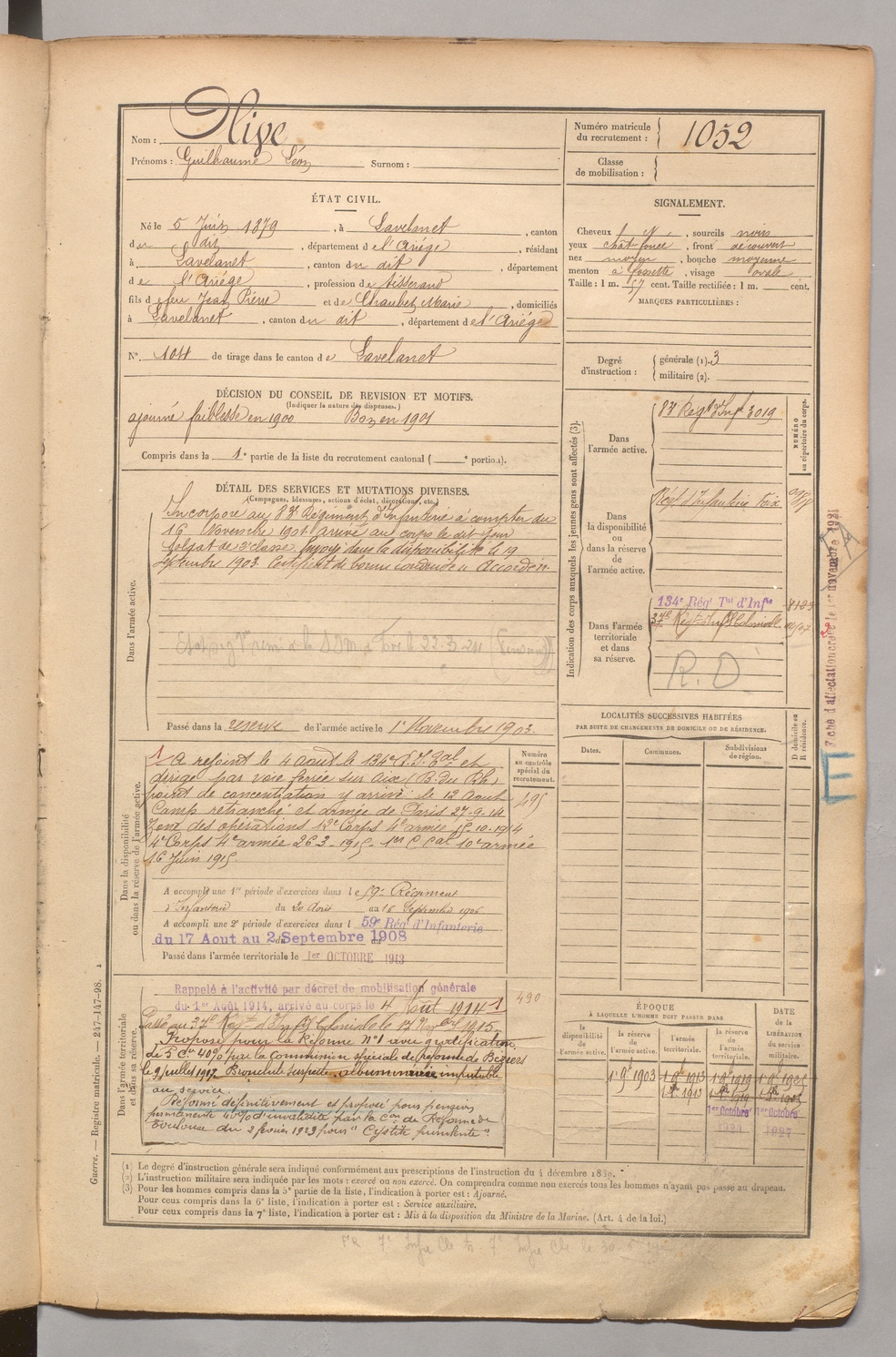 | Olive | Guilhaume Léon | FOIX | 1 R 458 | 1899 | Lavelanet | Lavelanet | 1052 |