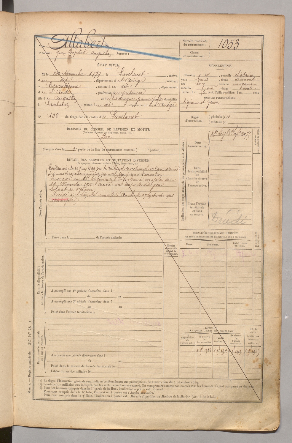 | Allabert | Jean Baptiste Augustin | FOIX | 1 R 458 | 1899 | Lavelanet | Carcassonne | 1053 |