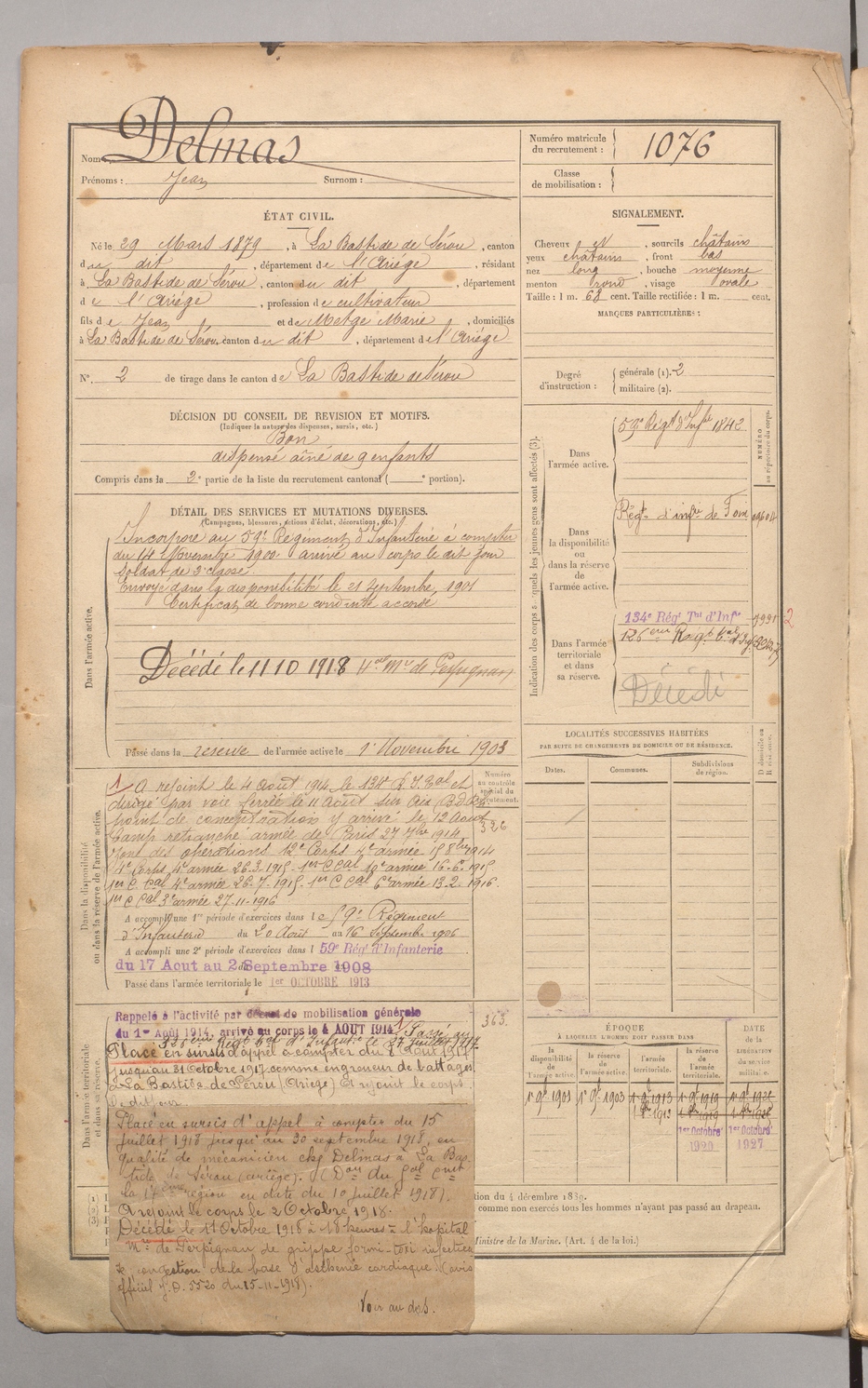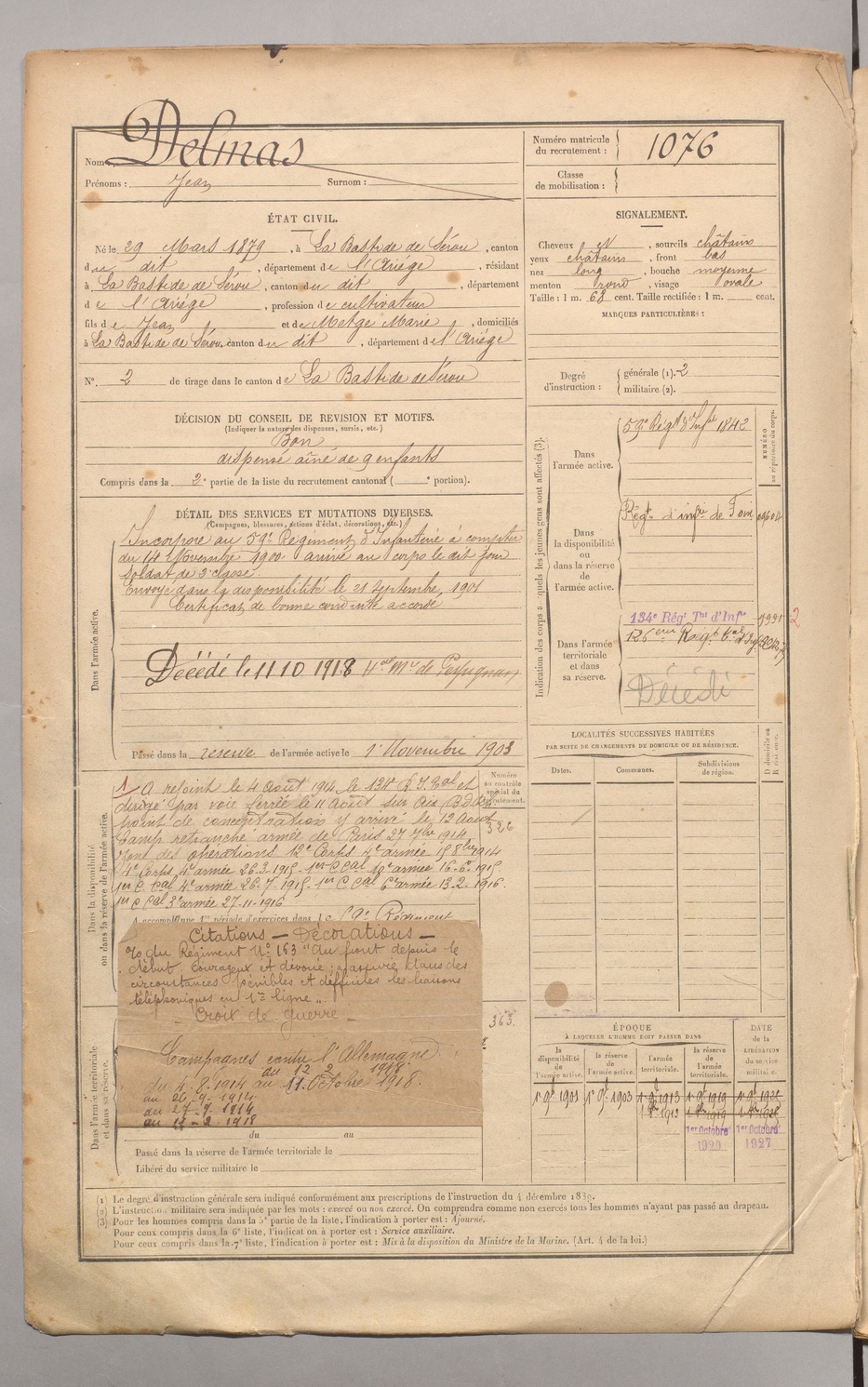 | Delmas | Jean | FOIX | 1 R 458 | 1899 | Bastide-de-Sérou (La) | Bastide-de-Sérou (La) | 1076 |