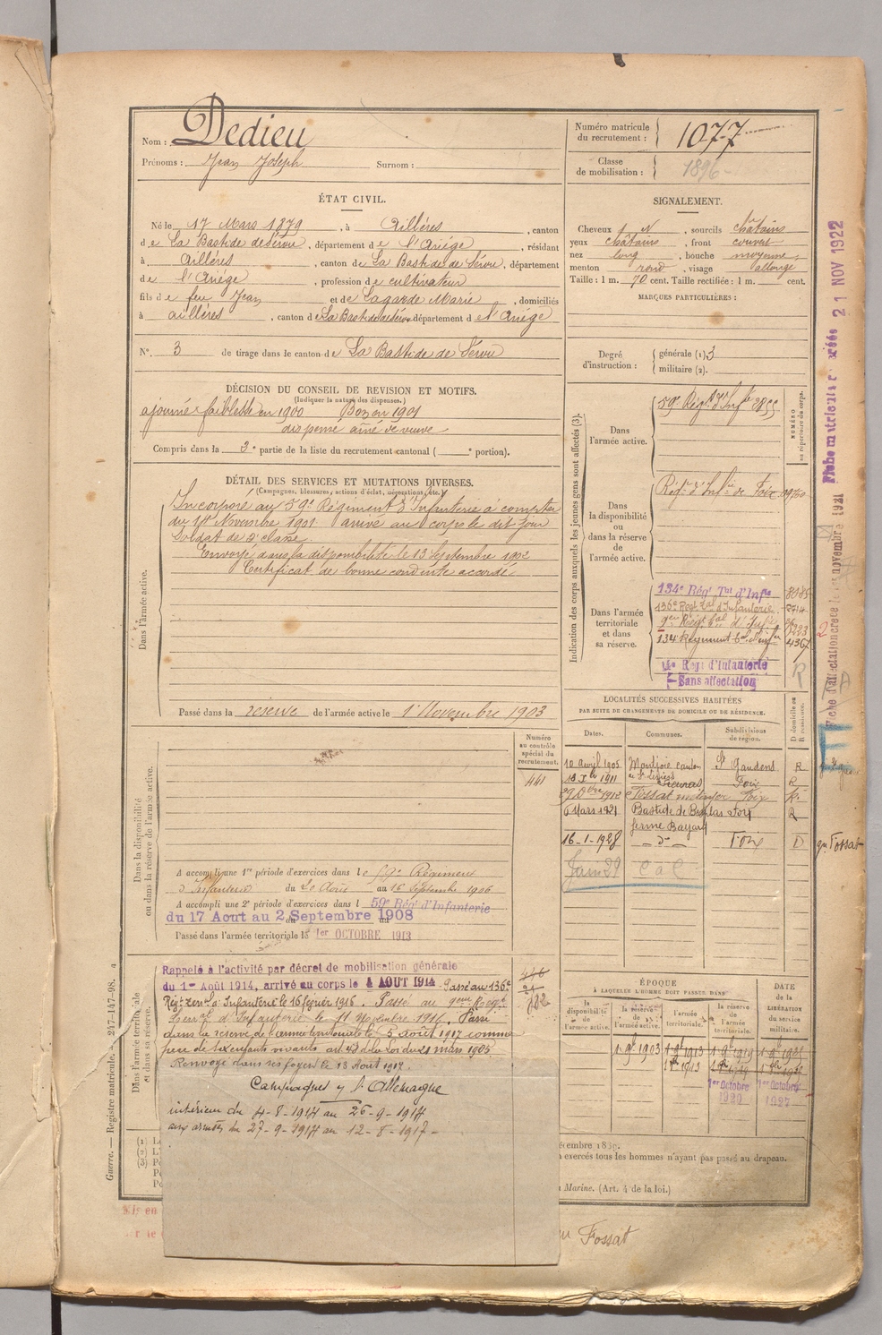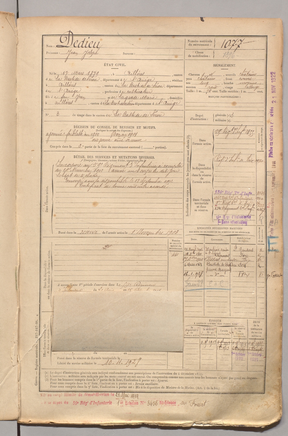| Dedieu | Jean Joseph | FOIX | 1 R 458 | 1899 | Allières | Allières | 1077 |