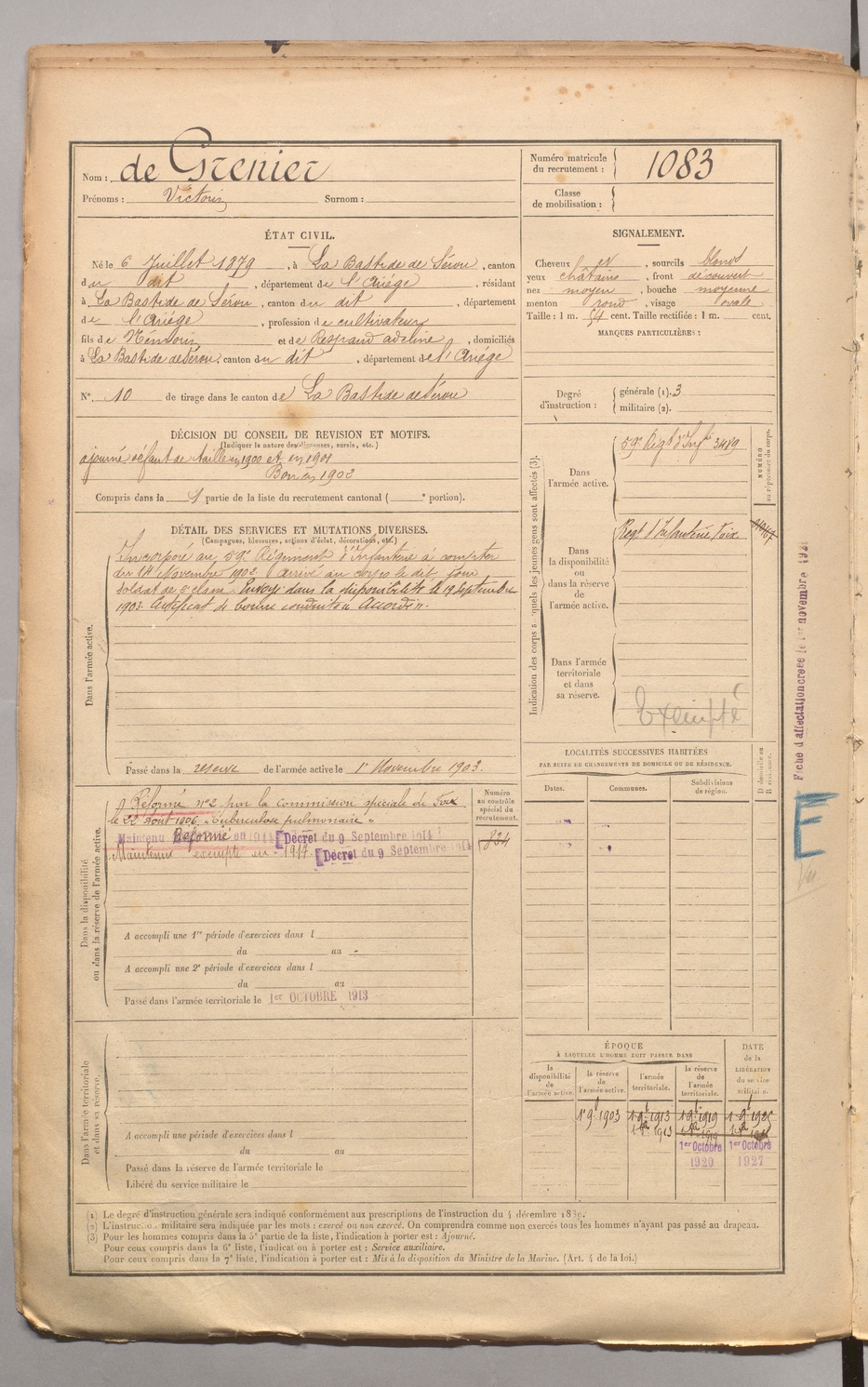 | De Grenier | Victorin | FOIX | 1 R 458 | 1899 | Bastide-de-Sérou (La) | Bastide-de-Sérou (La) | 1083 |