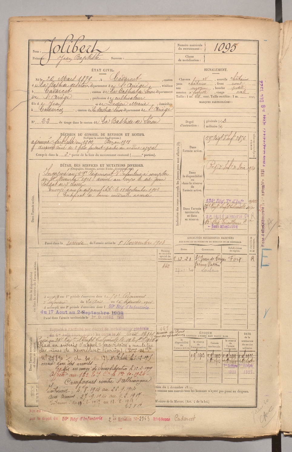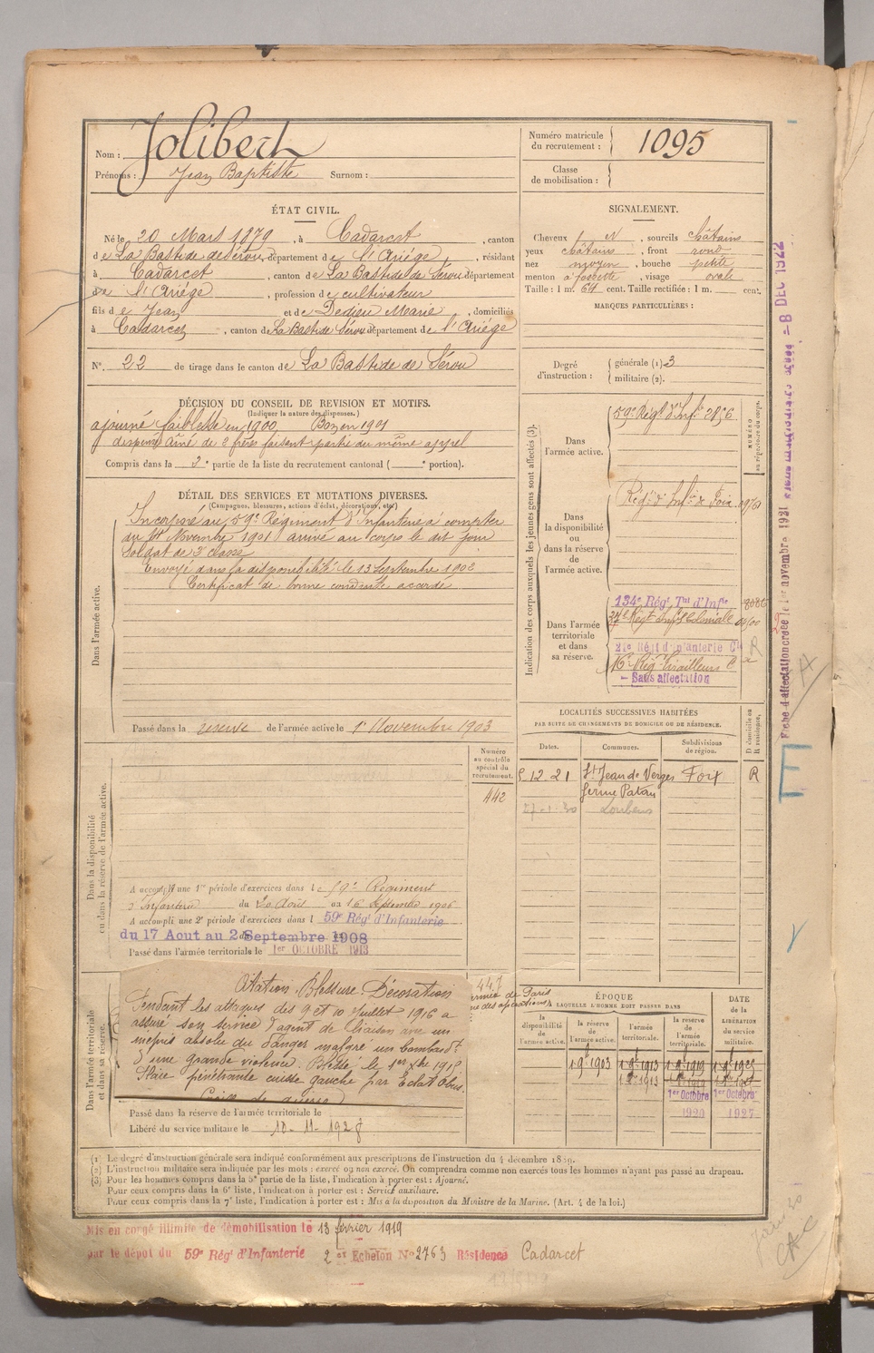 | Jolibert | Jean Baptiste | FOIX | 1 R 458 | 1899 | Cadarcet | Cadarcet | 1095 |