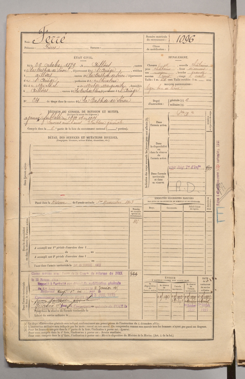 | Ferré | Pierre | FOIX | 1 R 458 | 1899 | Allières | Allières | 1096 |