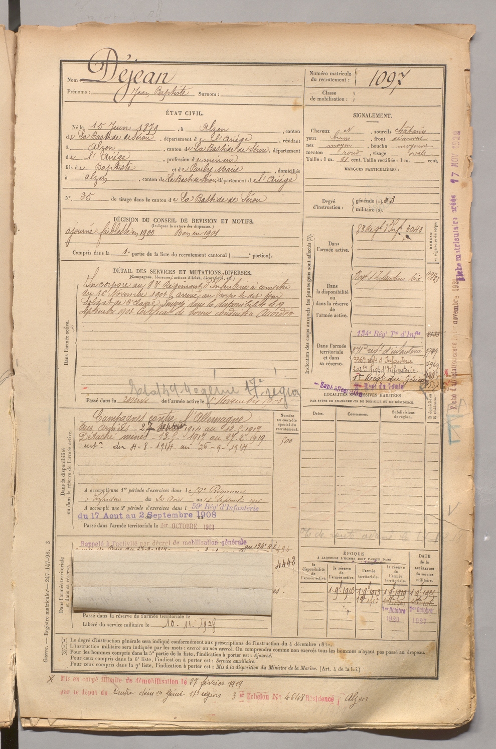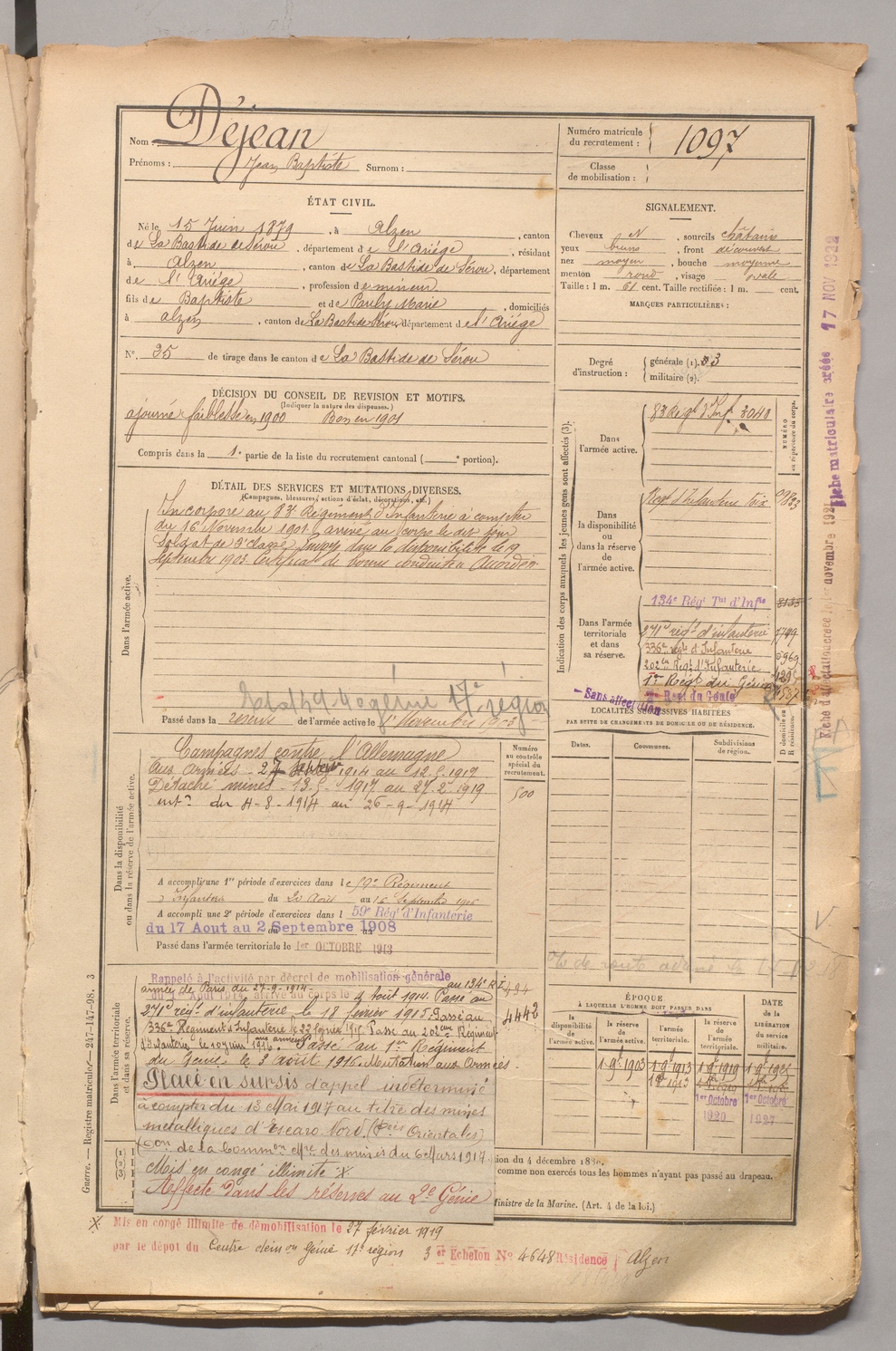 | Déjean | Jean Baptiste | FOIX | 1 R 458 | 1899 | Alzen | Alzen | 1097 |