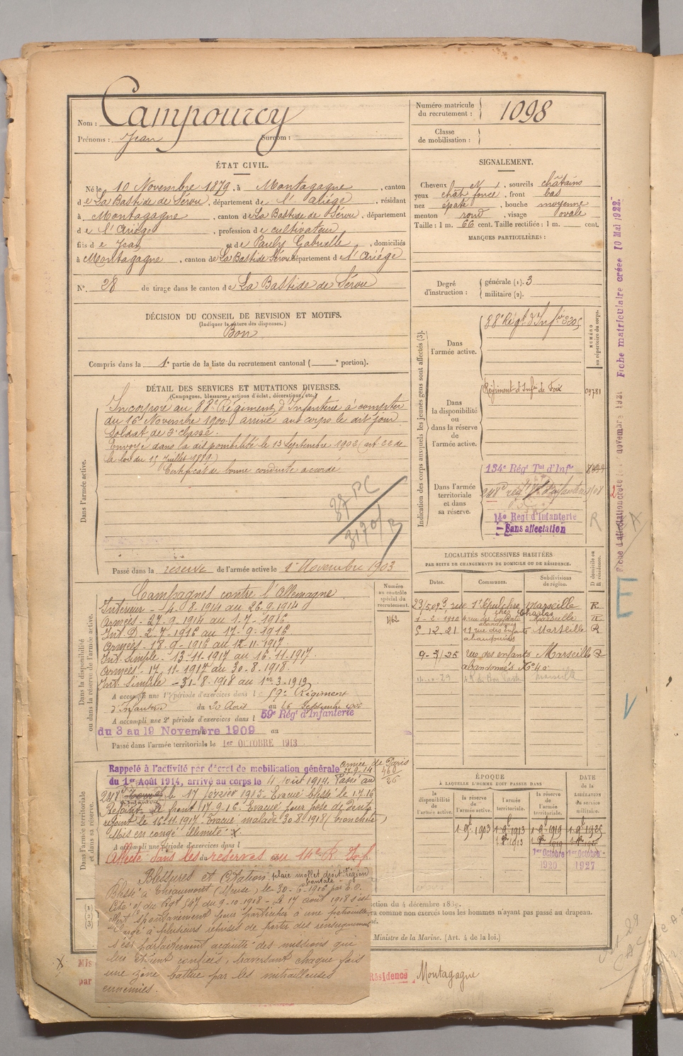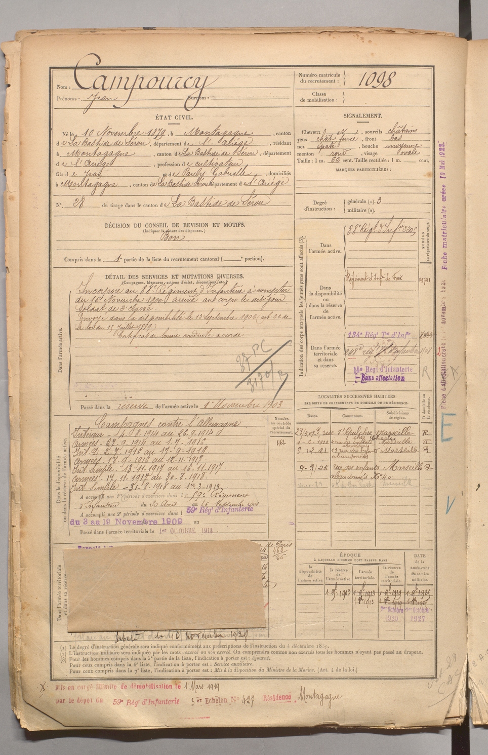 | Campourcy | Jean | FOIX | 1 R 458 | 1899 | Montagagne | Montagagne | 1098 |