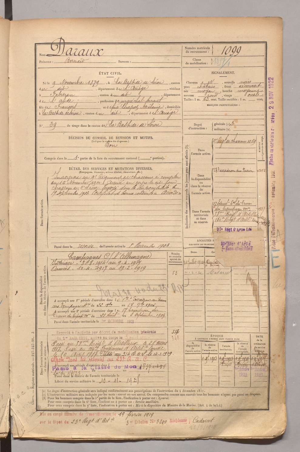 | Daraux | Bernard | FOIX | 1 R 458 | 1899 | Bastide-de-Sérou (La) | Fabrezan | 1099 |