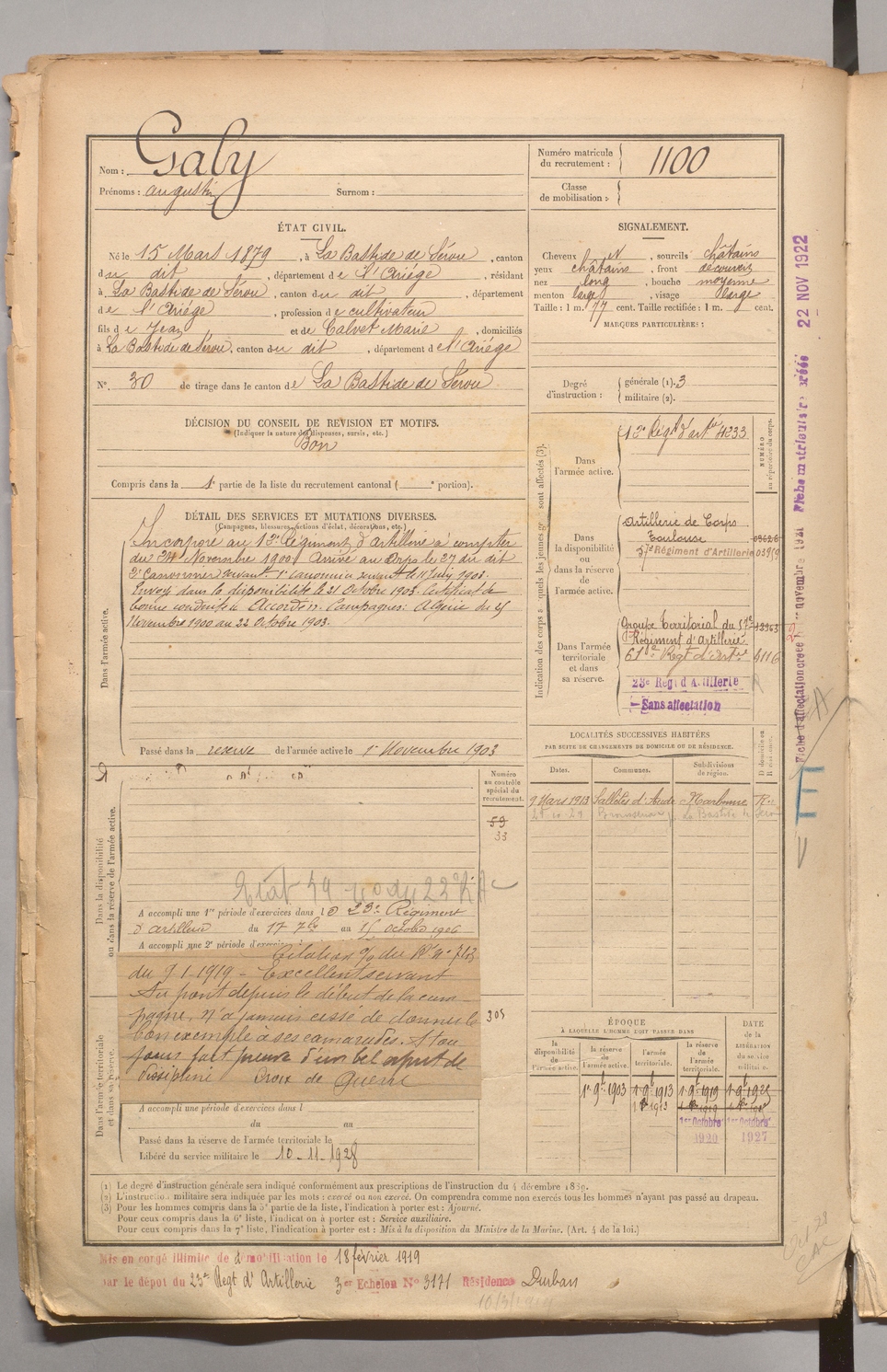 | Galy | Augustin | FOIX | 1 R 458 | 1899 | Bastide-de-Sérou (La) | Bastide-de-Sérou (La) | 1100 |
