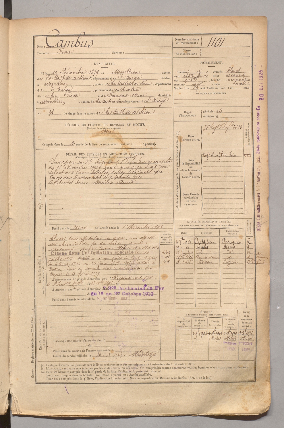 | Cambus | Pierre | FOIX | 1 R 458 | 1899 | Montseron | Montseron | 1101 |
