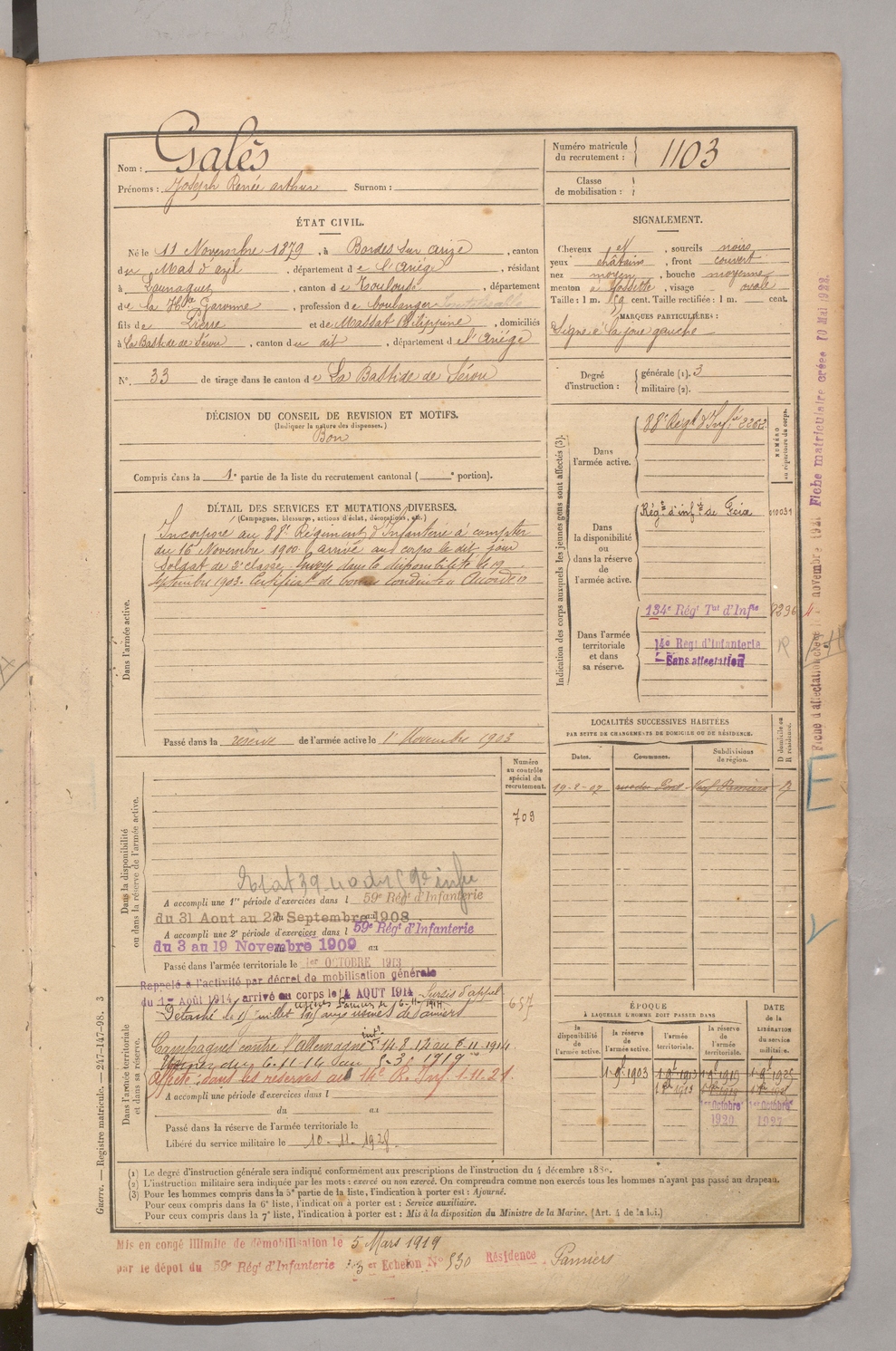 | Galès | Joseph René Arthur | FOIX | 1 R 458 | 1899 | Bordes-sur-Arize (Les) | Launaguet | 1103 |