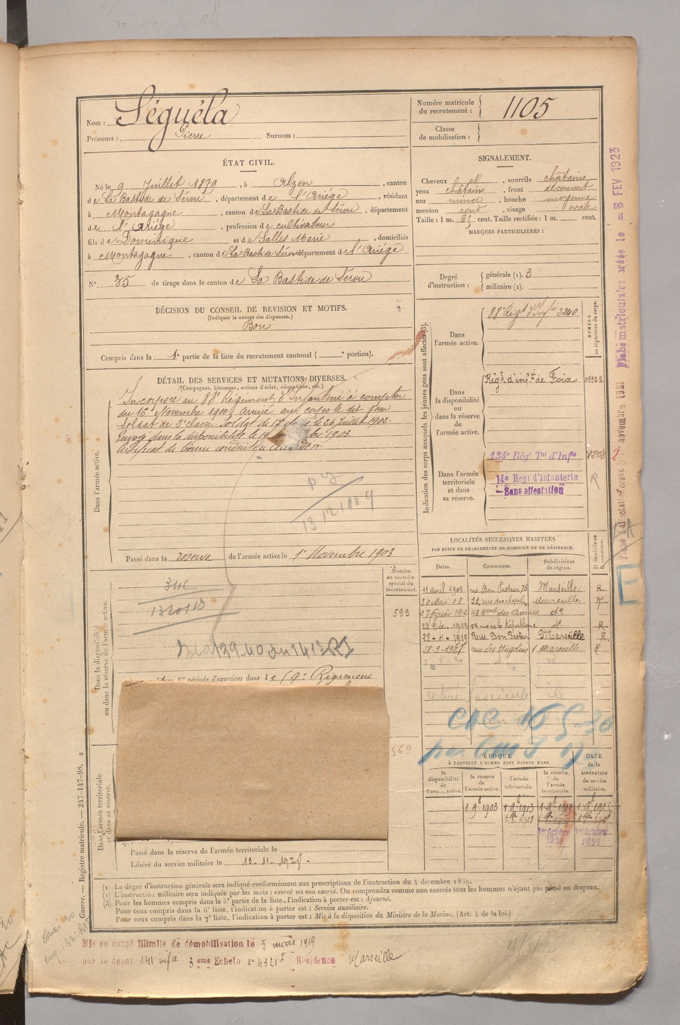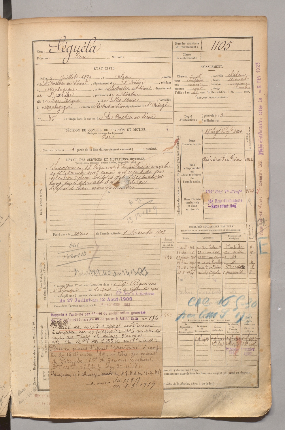 | Séguéla | Pierre | FOIX | 1 R 458 | 1899 | Alzen | Montagagne | 1105 |