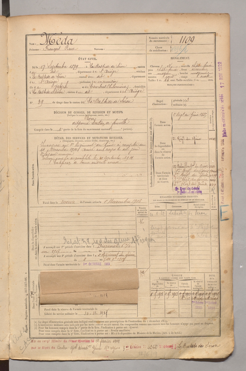 | Méda | François Pierre | FOIX | 1 R 458 | 1899 | Bastide-de-Sérou (La) | Bastide-de-Sérou (La) | 1109 |