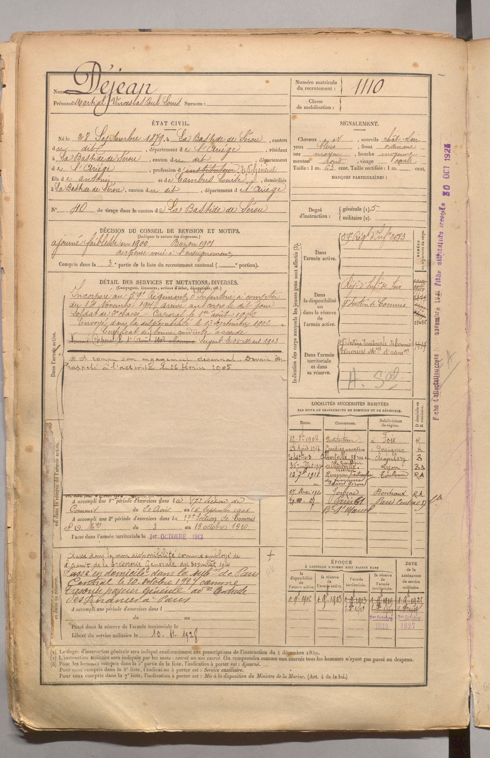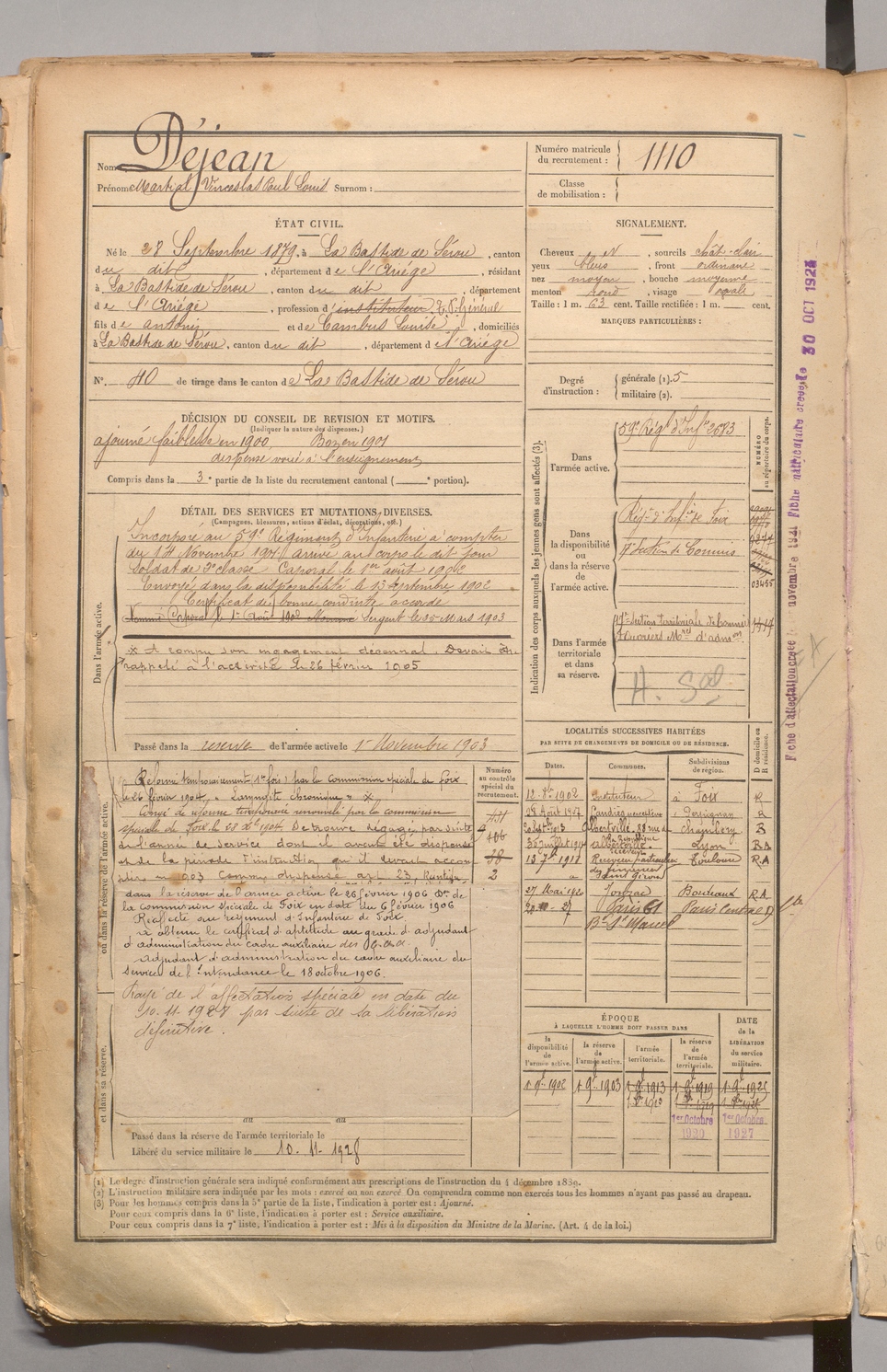 | Déjean | Martial Vinceslas Paul Louis | FOIX | 1 R 458 | 1899 | Bastide-de-Sérou (La) | Bastide-de-Sérou (La) | 1110 |