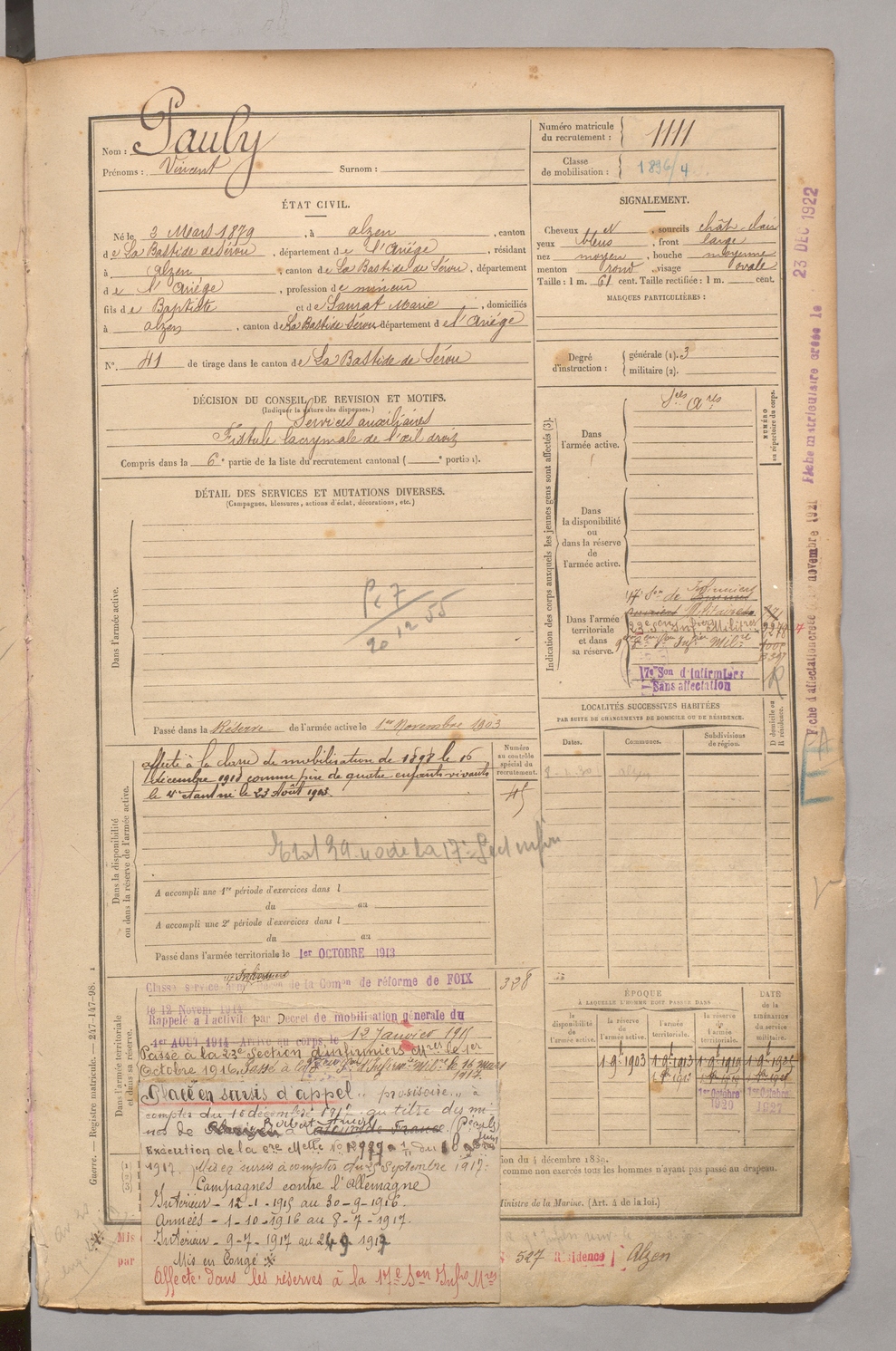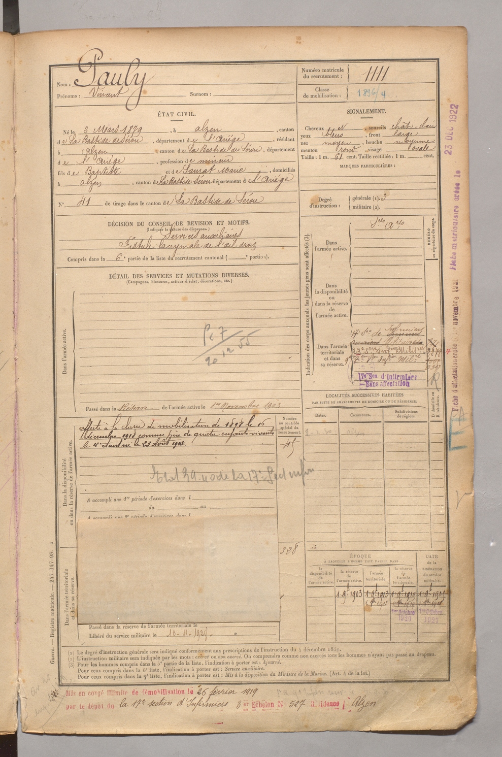 | Pauly | Vincent | FOIX | 1 R 458 | 1899 | Alzen | Alzen | 1111 |
