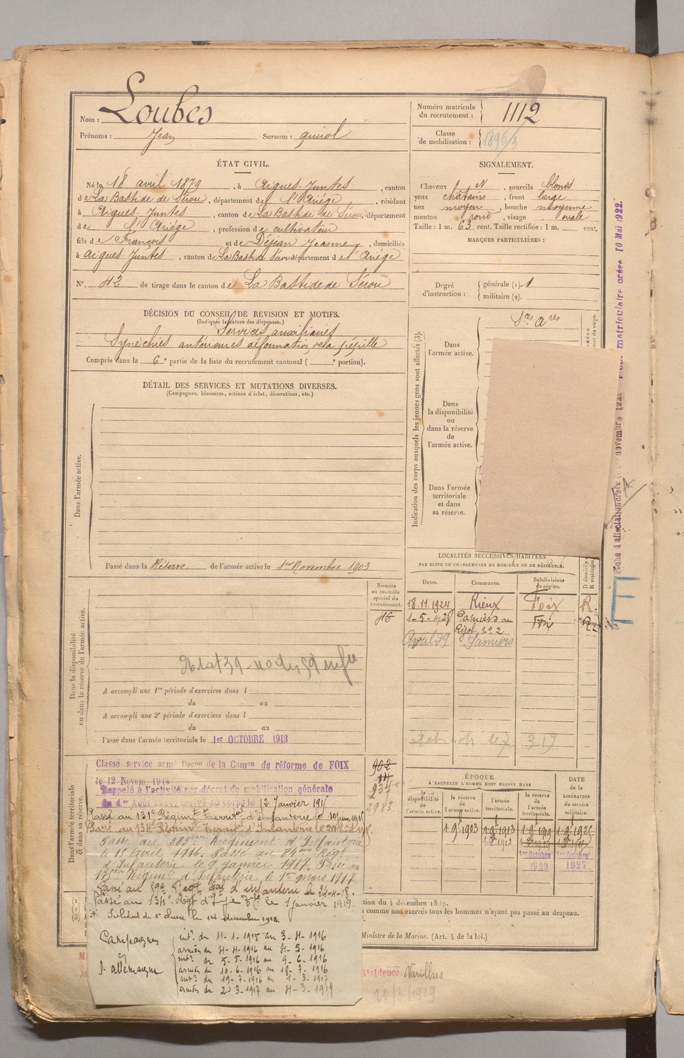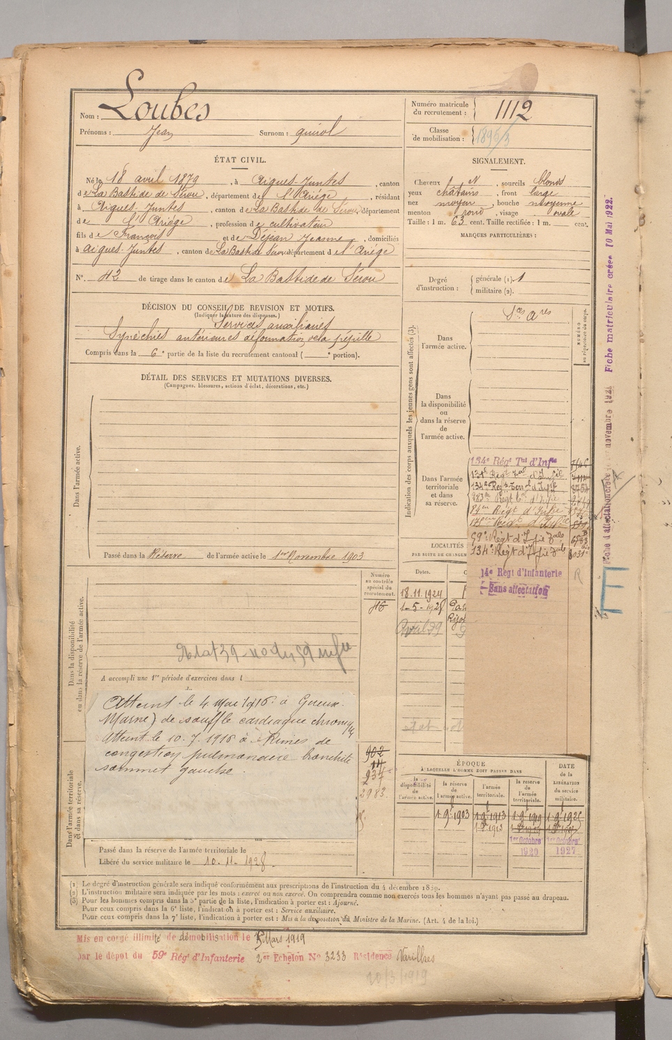 | Loubes | Jean dit Quirol | FOIX | 1 R 458 | 1899 | Aigues-Juntes | Aigues-Juntes | 1112 |