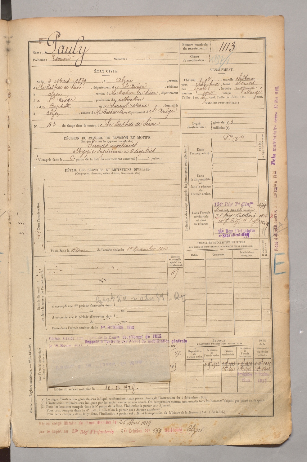 | Pauly | Edouard | FOIX | 1 R 458 | 1899 | Alzen | Alzen | 1113 |
