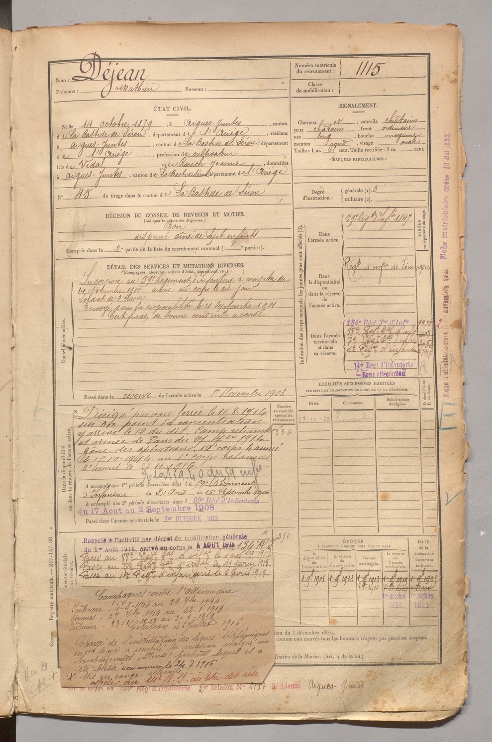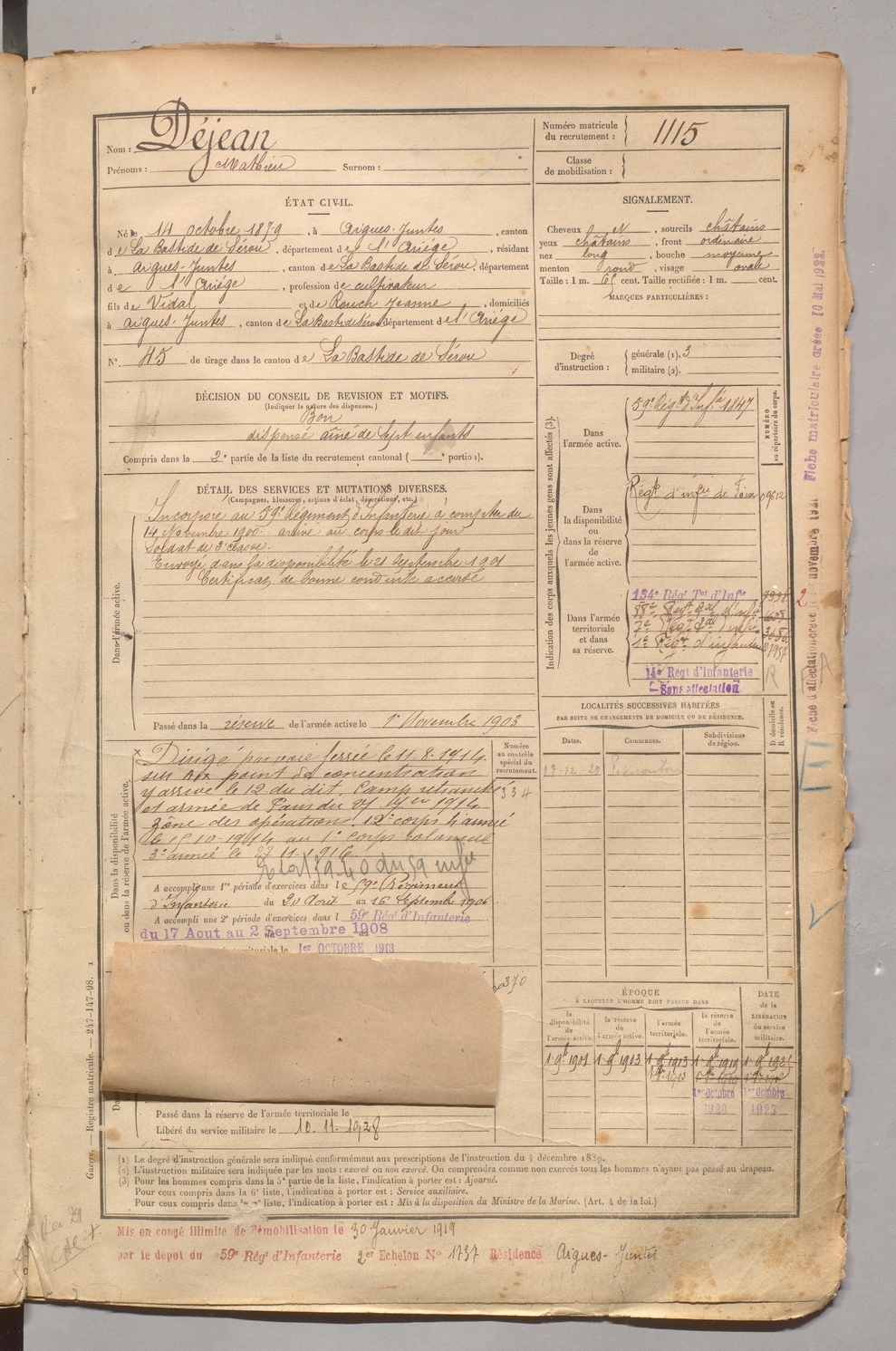| Déjean | Mathieu | FOIX | 1 R 458 | 1899 | Aigues-Juntes | Aigues-Juntes | 1115 |