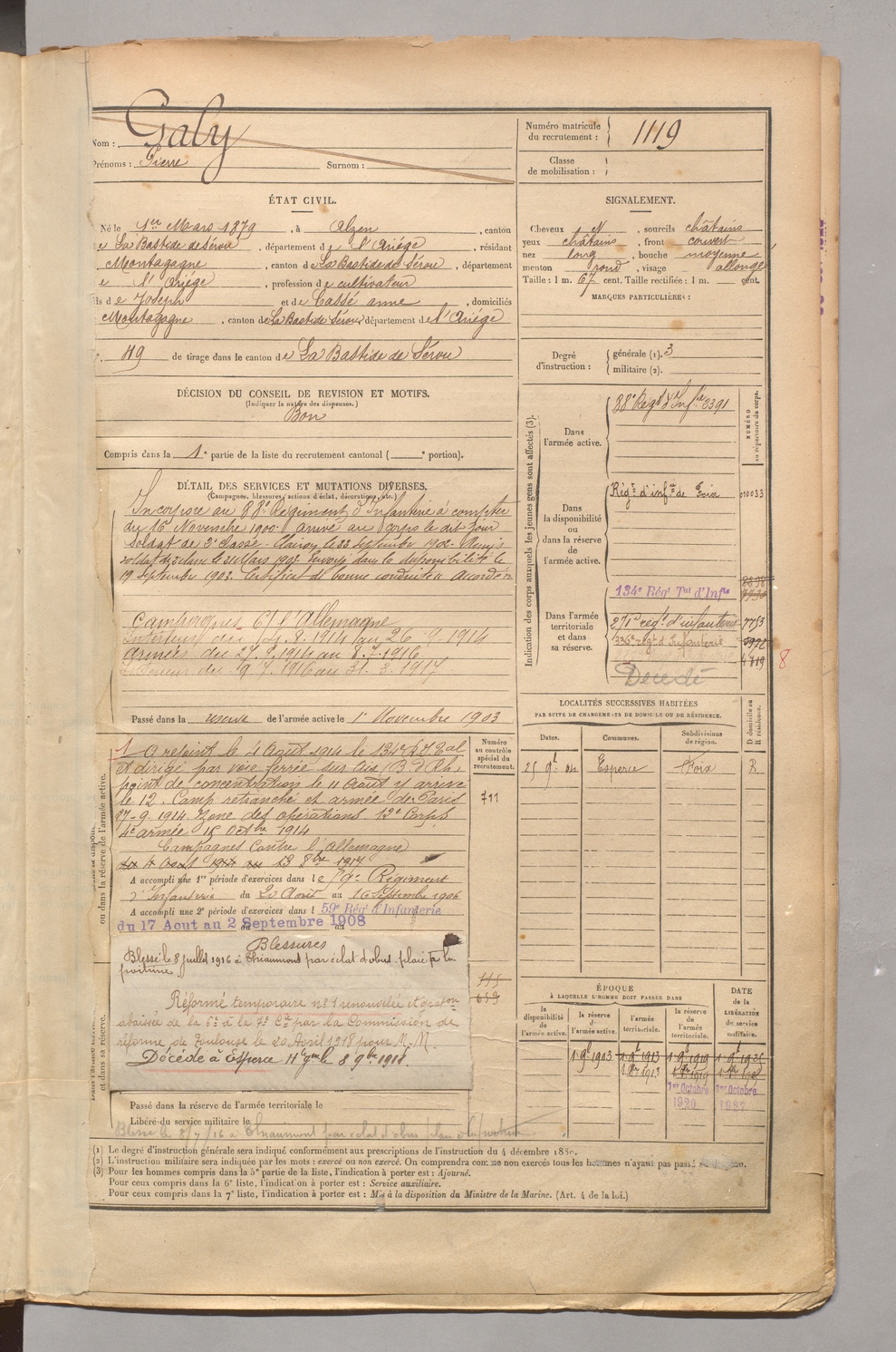 | Galy | Pierre | FOIX | 1 R 458 | 1899 | Alzen | Montagagne | 1119 |