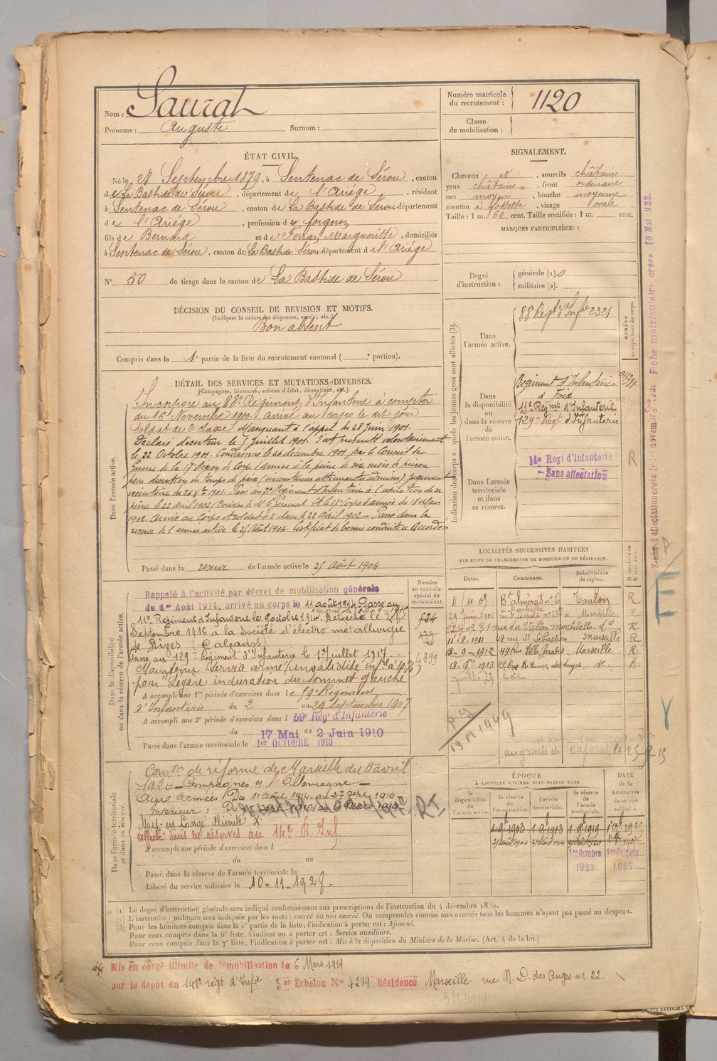 | Saurat | Auguste | FOIX | 1 R 458 | 1899 | Sentenac-de-Sérou | Sentenac-de-Sérou | 1120 |