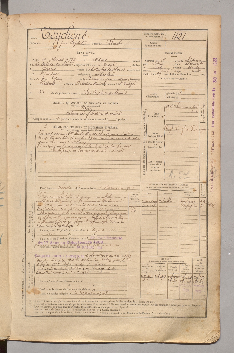 | Teychéné | Jean Baptiste dit Cllaret | FOIX | 1 R 458 | 1899 | Nescus | Nescus | 1121 |