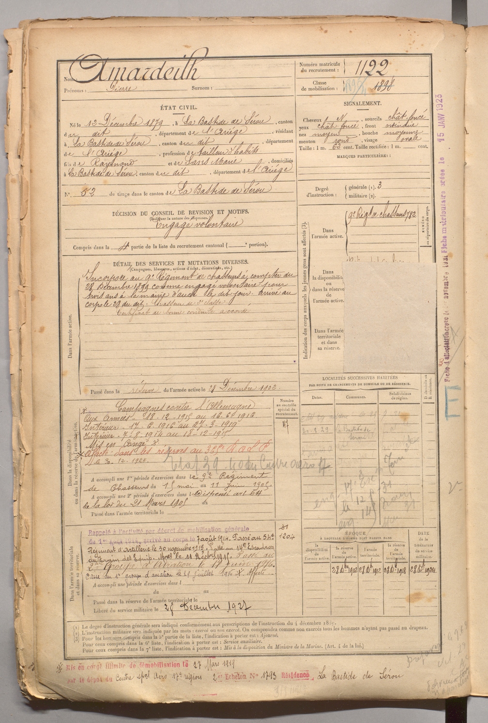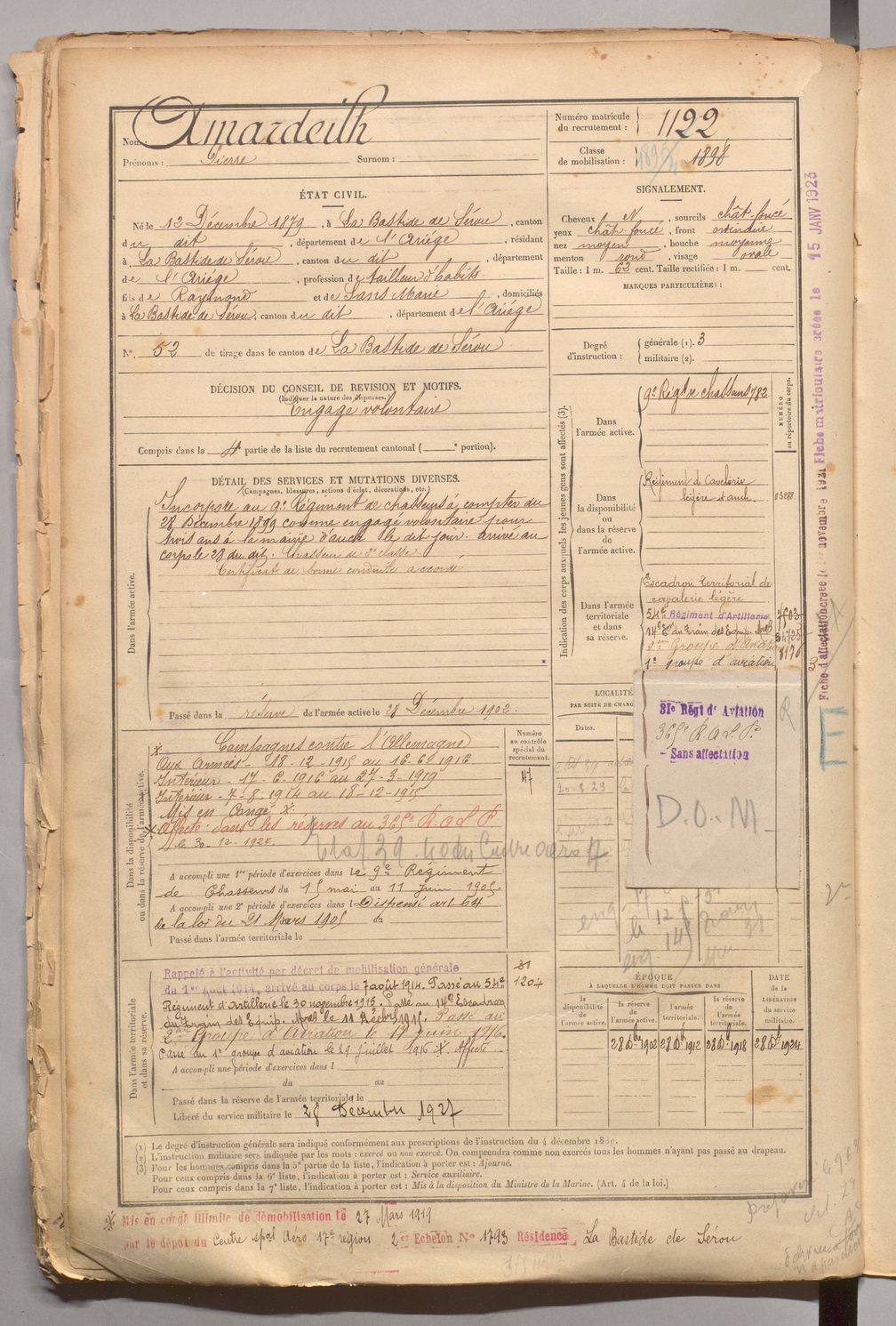 | Amardeilh | Pierre | FOIX | 1 R 458 | 1899 | Bastide-de-Sérou (La) | Bastide-de-Sérou (La) | 1122 |