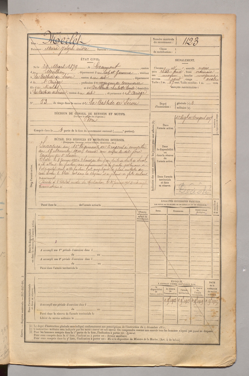 | Merlet | Marie Joseph André | FOIX | 1 R 458 | 1899 | Cocumont | Bastide-de-Sérou (La) | 1123 |