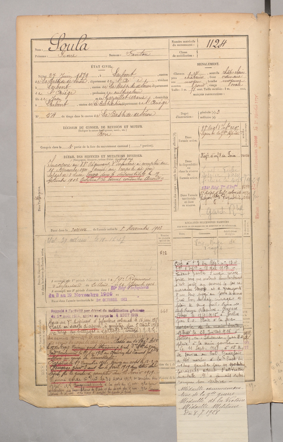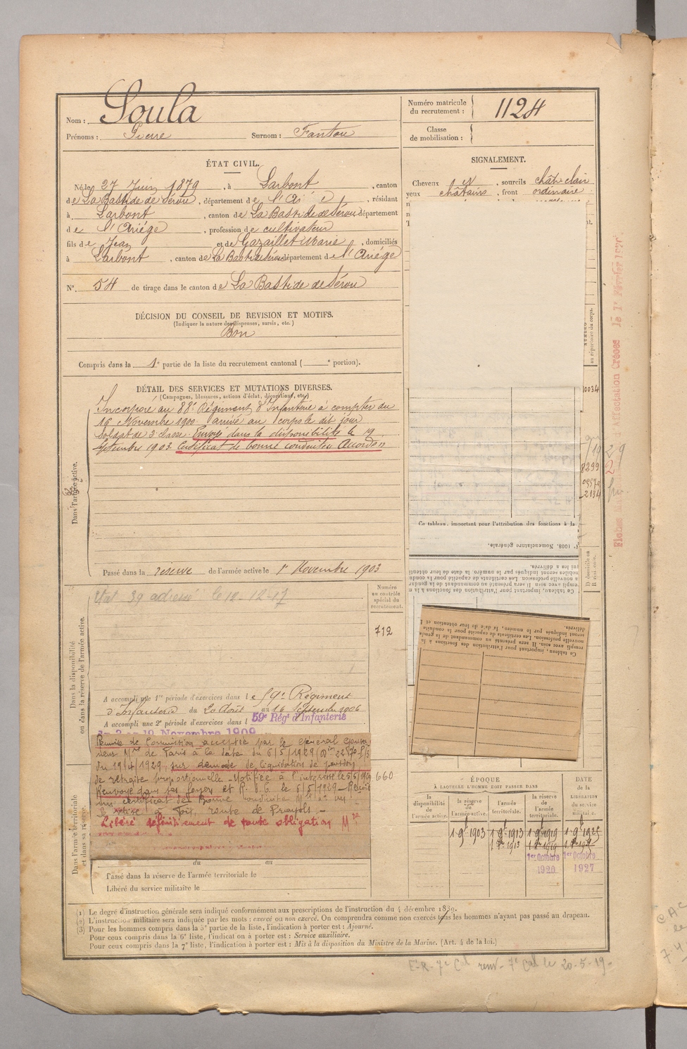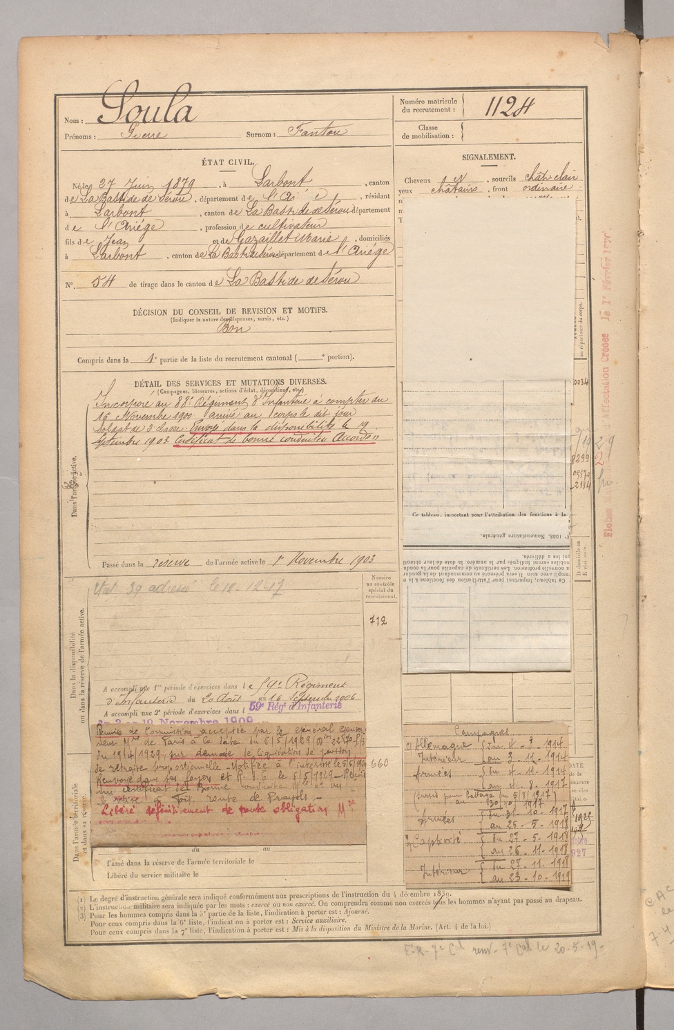 | Soula | Pierre dit Fantou | FOIX | 1 R 458 | 1899 | Larbont | Larbont | 1124 |
