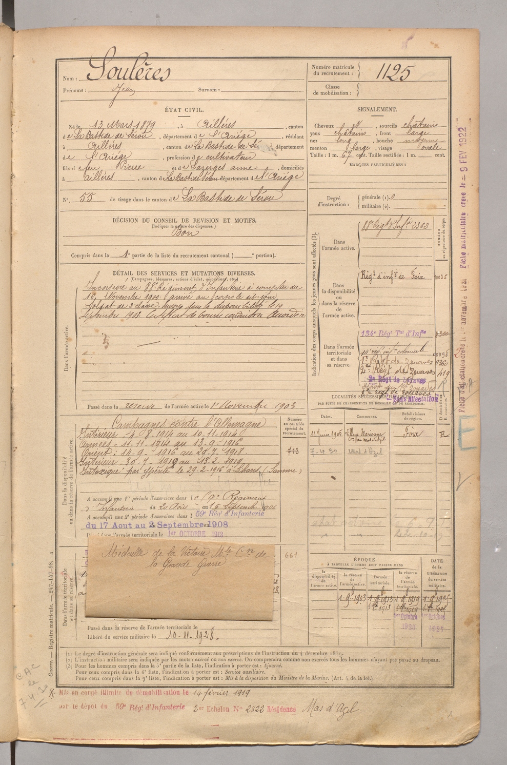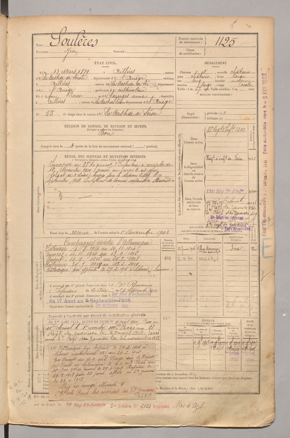 | Soulères | Jean | FOIX | 1 R 458 | 1899 | Allières | Allières | 1125 |