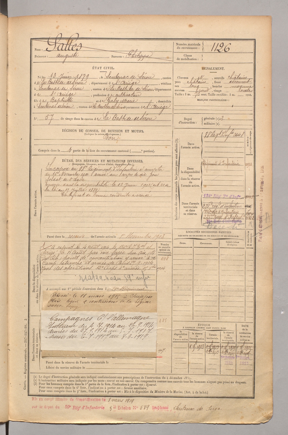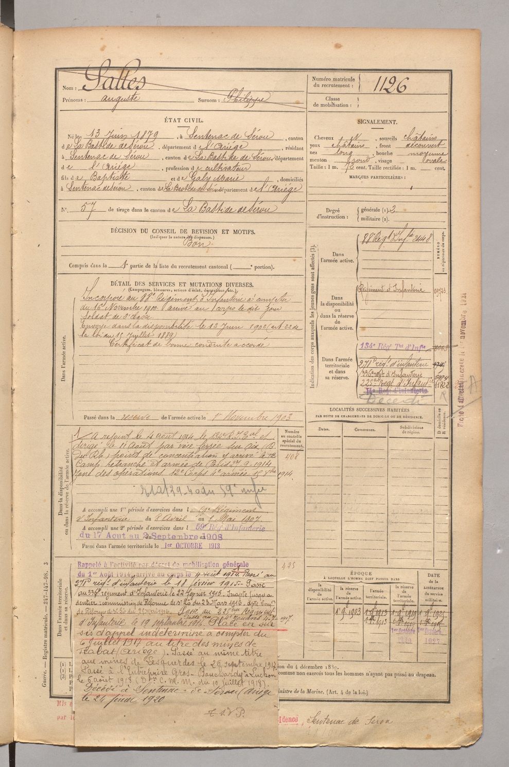 | Salles | Auguste dit Philippe | FOIX | 1 R 458 | 1899 | Sentenac-de-Sérou | Sentenac-de-Sérou | 1126 |